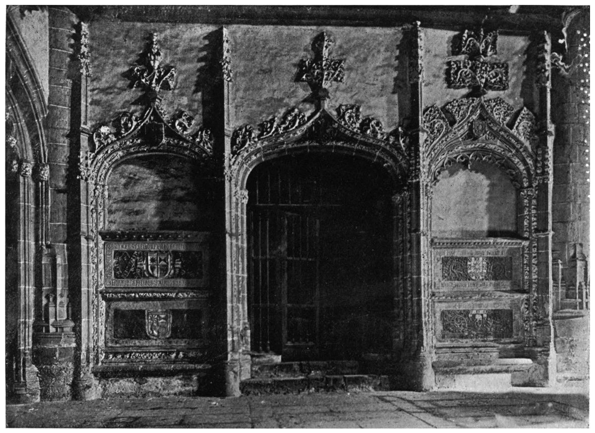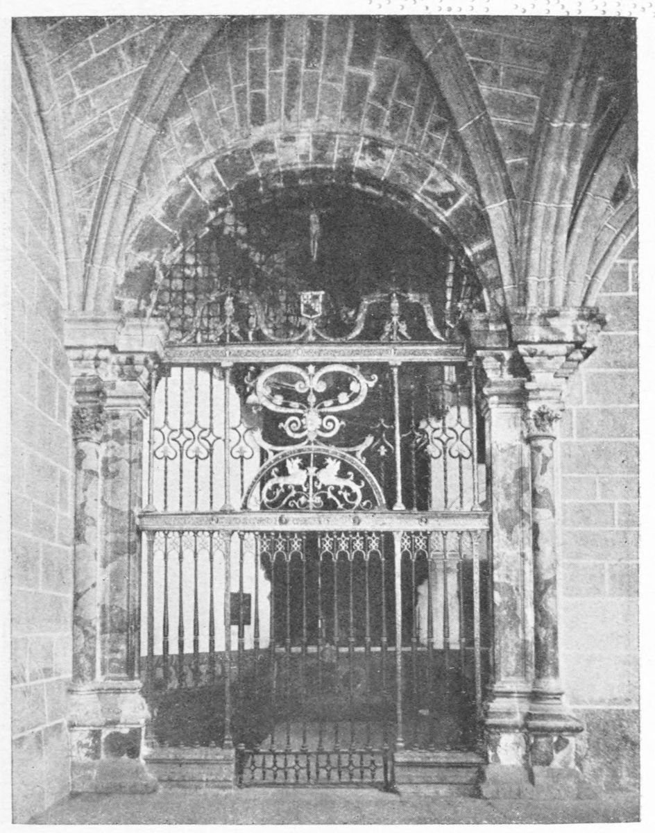 The Gothic church of San Francisco, now attached to a hospital, was founded by Fray Pedro, a companion of the great Francis of Assisi himself. This is the burying-place of the great family of Quirós, which claimed, in a not very reverent distich, to rank in point of dignity and antiquity next to the Divinity (‘Después de Dios, la casa de Quirós’). In the chancel lies Gonzalo Bernaldo de Quirós the Older, the youthful friend of Enrique of Trastamara, who died, wearing the religious habit, in 1575. Within a sepulchre upheld by lions which{53} bear escutcheons crossed by the bar sinister, are the ashes of another Gonzalo Bernaldo, a distinguished illegitimate scion of the house. He is shown clad in armour, and at his feet a dog—symbolical, possibly, of the fidelity and tenacity with which he watched over the interests of his family during the minority of its chiefs. Close by is the vault of the house of Valdecarzana; a modern inscription informs us that during the interment of one of that family, a live cow must be present in the church—why or wherefore not being stated.