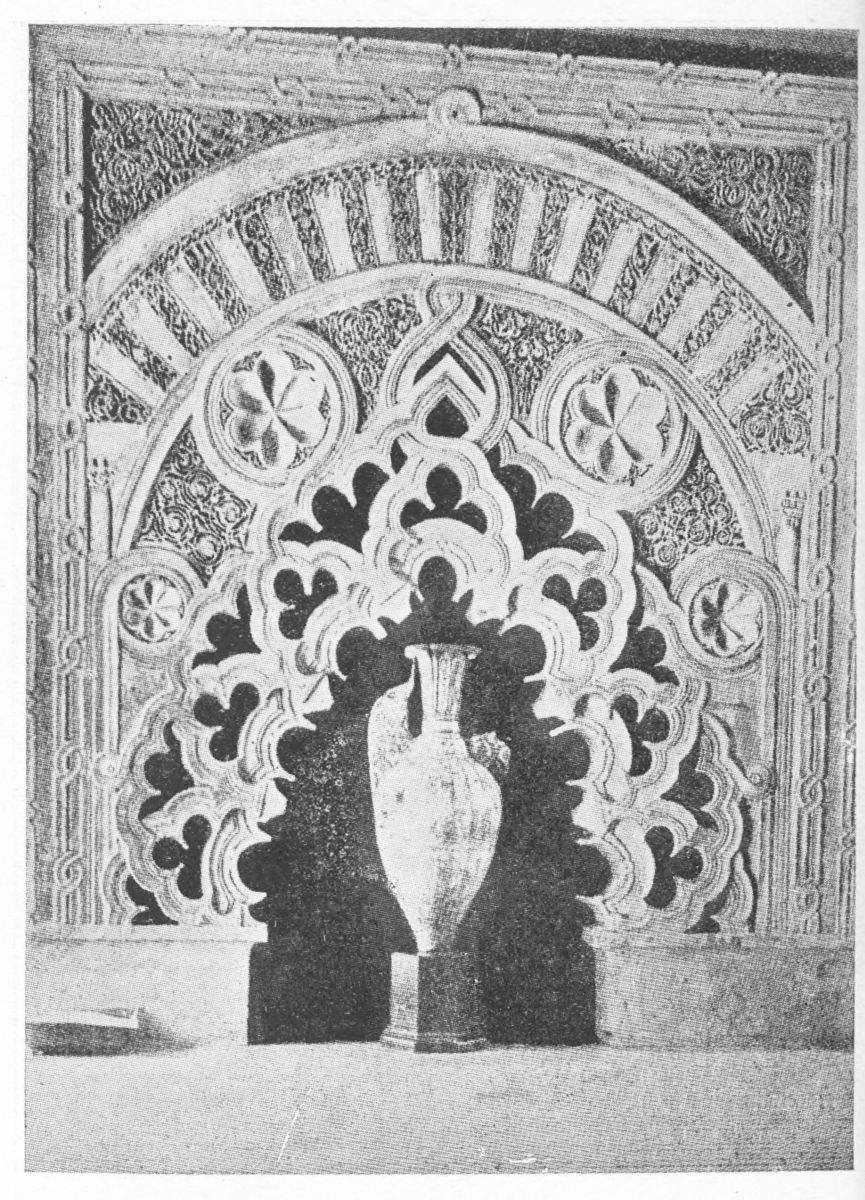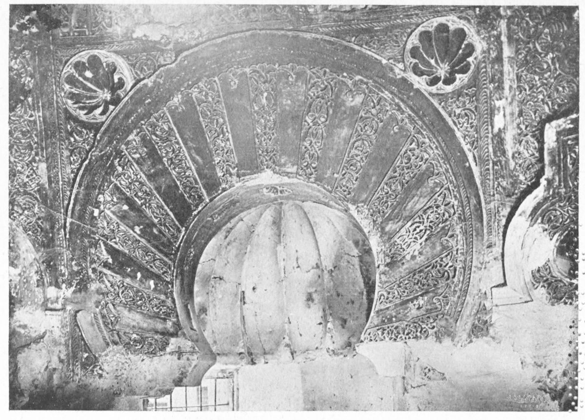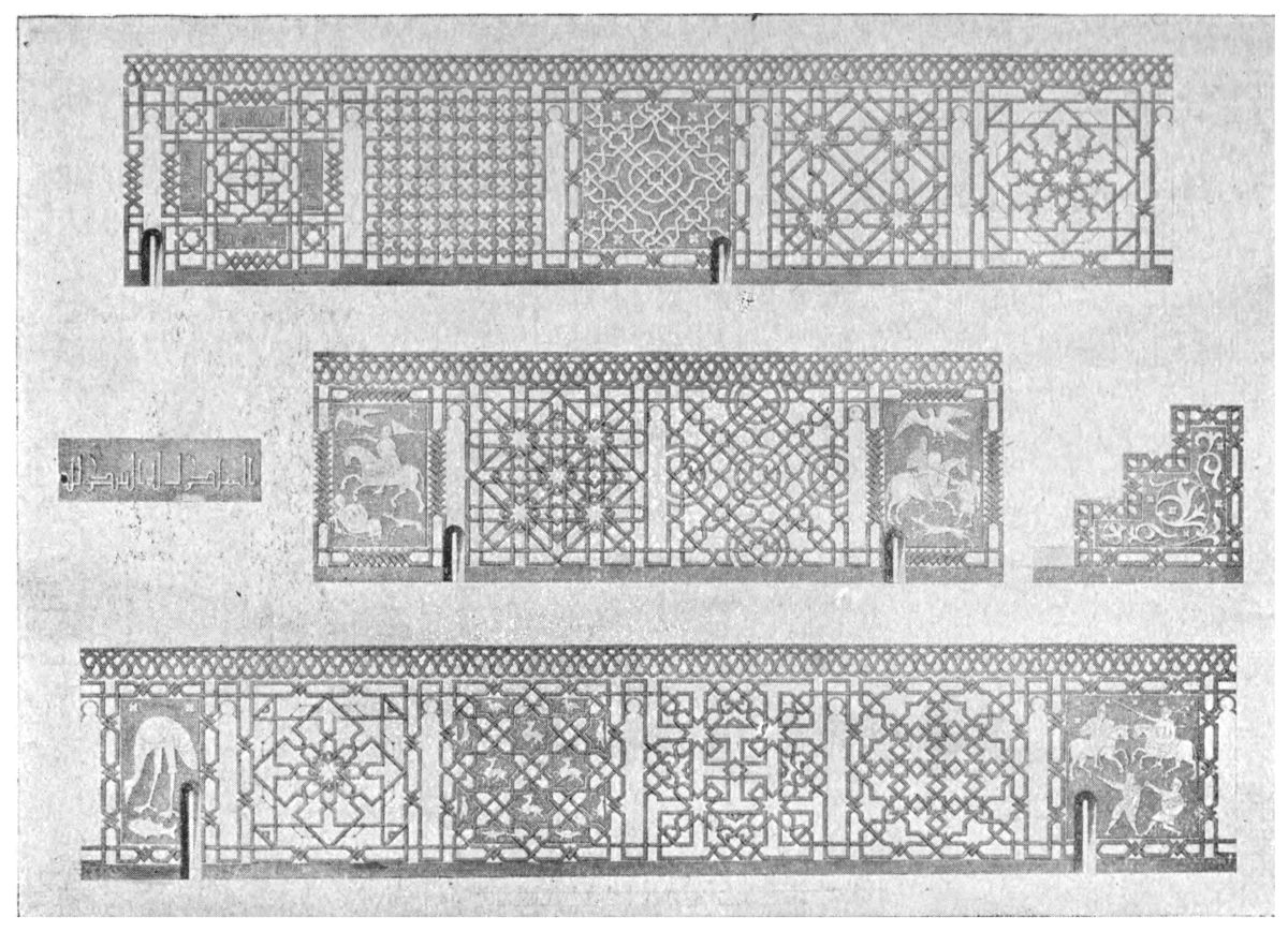 The vaultings are adorned with gilded pendants and bosses, very much in the Moorish style. The light red marble pavement, with rays diverging from the yellow marble bases of the columns, appears to have been intended to suggest a reflection of the roof with its ogive vaultings above. The decoration is tasteful and not elaborate. The capitals are sculptured with putti upholding escutcheons with animals and foliage.