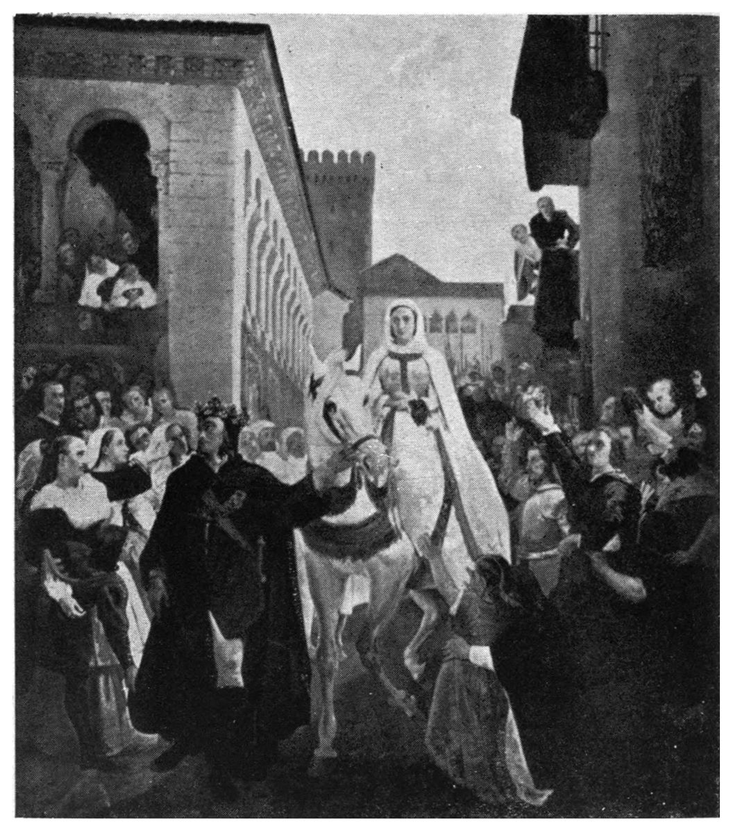 Valladolid, always on the side of authority, accepted ‘the Catholic Kings’ on the death of Enriqùe, to the exclusion of Juana, whom a modern writer inexplicably calls that monarch’s illegitimate daughter. She was barred from the succession on the ground that she was not his daughter at all. The vigorous but hardly beneficent rule of Ferdinand and Isabel was celebrated in 1489 by eighteen persons being burned alive in the Plaza Mayor, while a few years after the city was emptied of its Jewish inhabitants. A whole quarter left tenantless, deserted homes, and smoking human sacrifices marked the inauguration of the New Monarchy in Valladolid. Yet the city prospered, and was too busy to notice the worn-out adventurer, the Admiral of the Indies, the immortal Christopher Columbus, who died within its walls on May 20, 1506. But all their prosperity could not reconcile the sturdy citizens to the arbitrary government of{11} Charles V.’s regents. Valladolid threw in her lot with the Comunidad. Her sons bled in the cause of liberty beside Padilla on the fatal field of Villalar; and when the Flemish emperor proclaimed an amnesty on visiting the city in 1522, many of her townsmen found themselves among the three hundred specially excluded from its operation.