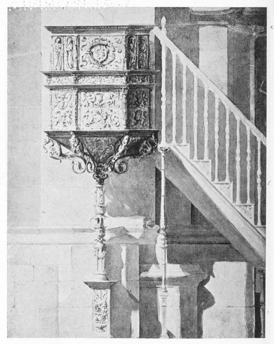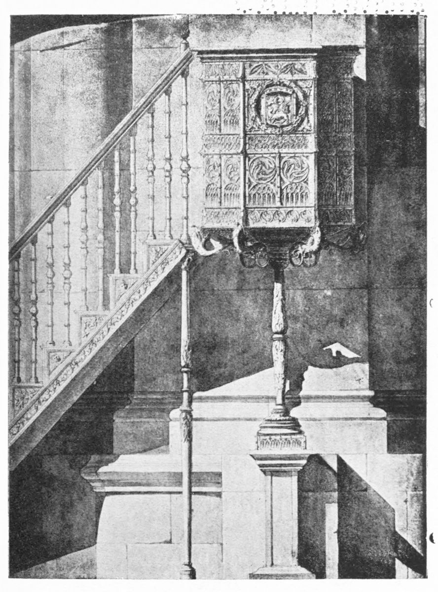 In the sacristy is one of the finest specimens of the metal-work for which Spain has always been renowned. The solid silver monstrance, by Juan de Arfe, is 6½ feet high, and weighs upwards of 150 lbs. It is in the shape of a temple in four stories, two of which are octagonal, and two circular. Statuettes of Adam and Eve, and a{24} relief of the mystery of the Conception, adorn this exquisite work, for which the artificer received 44,000 reals.