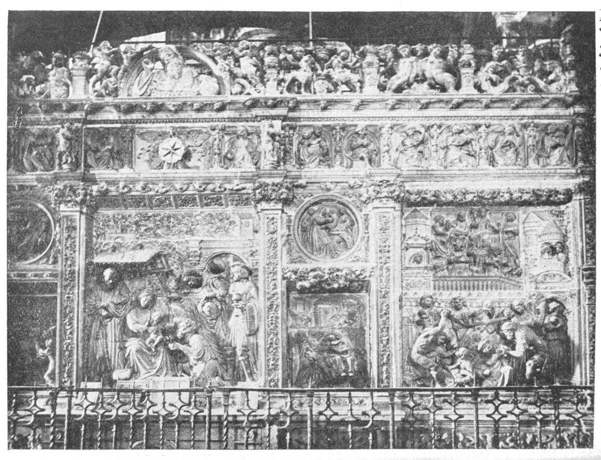 The choir stalls merit attention. They were designed by the Navarrese Estebán de Obray, and carved by the Florentine Giovanni Moreto and Nicolás de Jobato between 1542 and 1548. The infinite number and variety of the designs, the delicacy and intricacy of the work, suggest that it was accomplished in two or more generations rather than in six years. Equally admirable is the bronze reja by Juan Tomás Celina (1574) on a marble base, sculptured by the Majorcan artist, Guillermo Salvá.