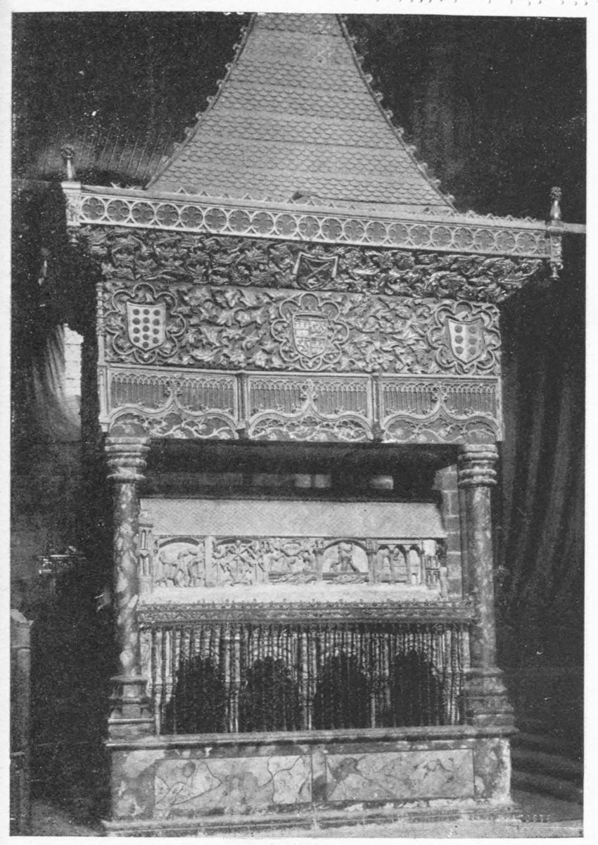 Before the High Altar the coronation took place, and the king, robed like a deacon, prostrated himself before the primate. On the gospel side is the wooden coffin which contains the ashes of Maria, daughter of Jaime lo Conqueridor, who died in 1267. At her side is the noble marble tomb of Archbishop Don Juan de Aragon, brother of Ferdinand the Catholic, with{151} statues of the Mater Dolorosa, attended by Saints Jerome, Martin, and Francis. Here are also the tombs of Archbishop Don Alonso, natural son of Ferdinand the Catholic, and of his natural son, also Archbishop, Don Fernando. The first-named did not take orders till after the birth of his son and successor, and only celebrated one mass, deeming himself unworthy of the sacerdotal functions. Beneath a tablet is deposited the heart of the Infante Baltasar Carlos, eldest son of Philip IV., carried off by smallpox at the age of seventeen. His portrait is familiar to students of Velazquez.