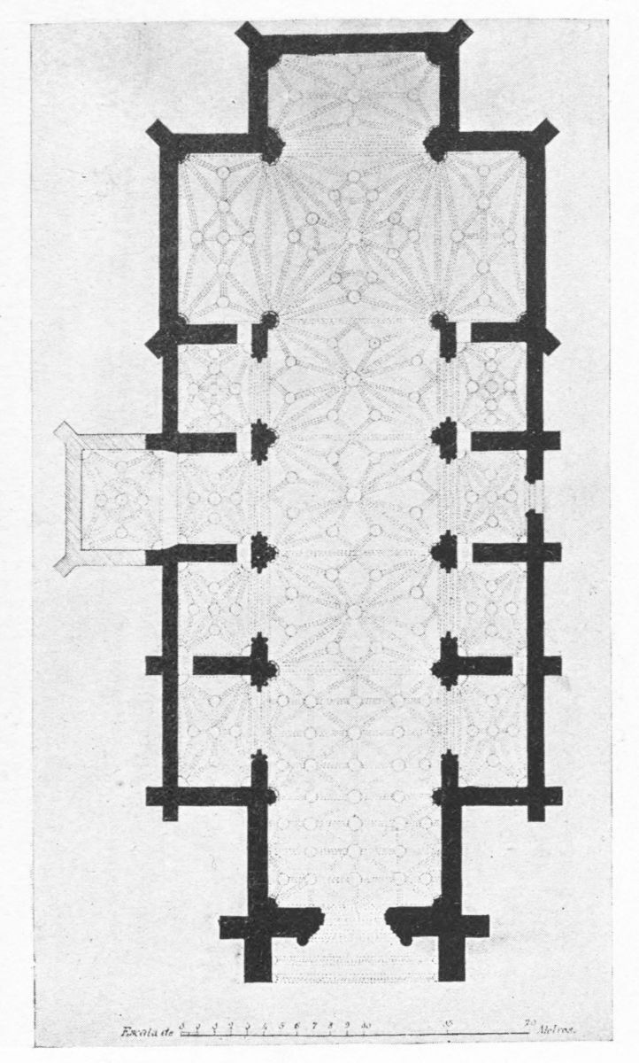 The church is of unusual breadth, there being two aisles and a row of chapels on each side of the nave. ‘The nave and aisles,’ says the{149} authority we have just quoted, ‘are all roofed at the same level, the vaulting springing from the capitals of the main columns, and the whole of the light is admitted by windows in the end walls, and high up in the outer walls of the aisles. In this respect Spanish churches of late date almost always exhibit an attention to the requirements of the climate, which is scarcely ever seen in the thirteenth and fourteenth centuries; and this church owes almost all its good effect to this circumstance, for it is in light and shade only, and neither in general detail nor in design that it is a success.’