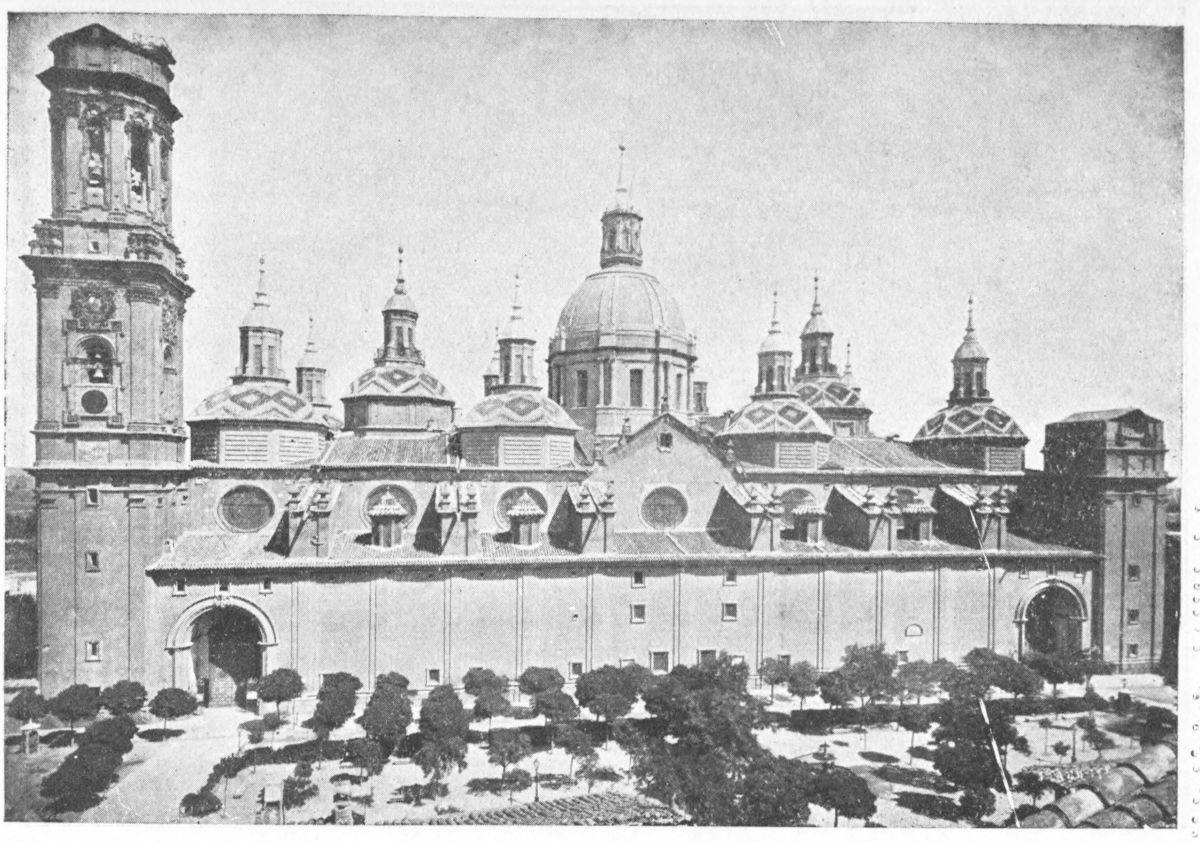 We have left almost to the last that ambitious but meretricious memorial of the decadence, the new cathedral, or Iglesia del Pilar. The Apostle James (Santiago), according to tradition, visited the city forty years after the birth of Christ. He was favoured by a vision of the Blessed Virgin,{159} poised on a pillar of jasper, and attended by angels. He built a modest chapel on the spot, which soon became a great resort of pilgrims. This was replaced in the thirteenth century by a large church, which was demolished to make room for the present building, erected in 1686 by Don Francisco Herrera. The design, bad enough in itself, was made worse by Ventura Rodriguez seventy years later. The exterior hardly merits description, though the domes or cupolas with their brilliant green, yellow, and white tiling are not without a certain bizarre beauty.