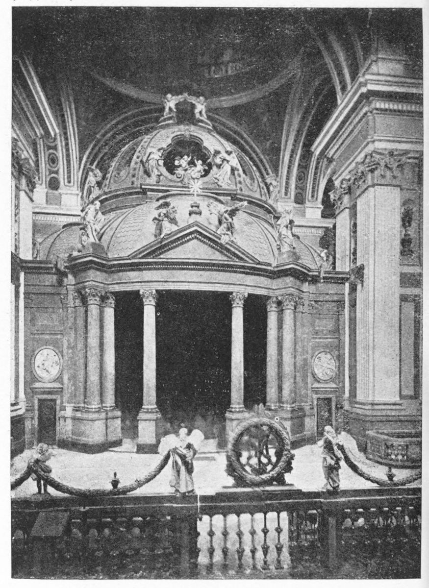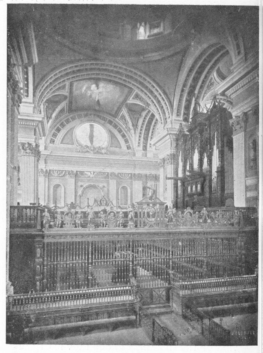 The interior is not wanting in majesty and massiveness. Only the nave, with its aisles and chapels, has been completed. The huge piers carry bold arches, separated by a broad cornice from a plastered and panelled groined ceiling. The walls are destitute of ornament, but over the arched entrances to the chapels runs an open gallery with balustrades. The aisles have been obstructed by ‘provisional chapels,’ which{23} Herrera would have indignantly swept away; and the choir, which he intended to place behind the High Altar, is now placed so as to block the best view of the nave. The Capilla Mayor, placed in the crossing, is in bad taste, with innumerable doors and tribunes piercing its walls. One cannot but agree with the Spanish writer who says that nothing is wanting to destroy the impression of ‘a grand whole,’ which Herrera was especially anxious to create.
