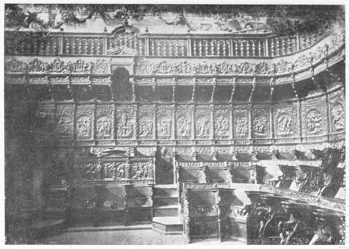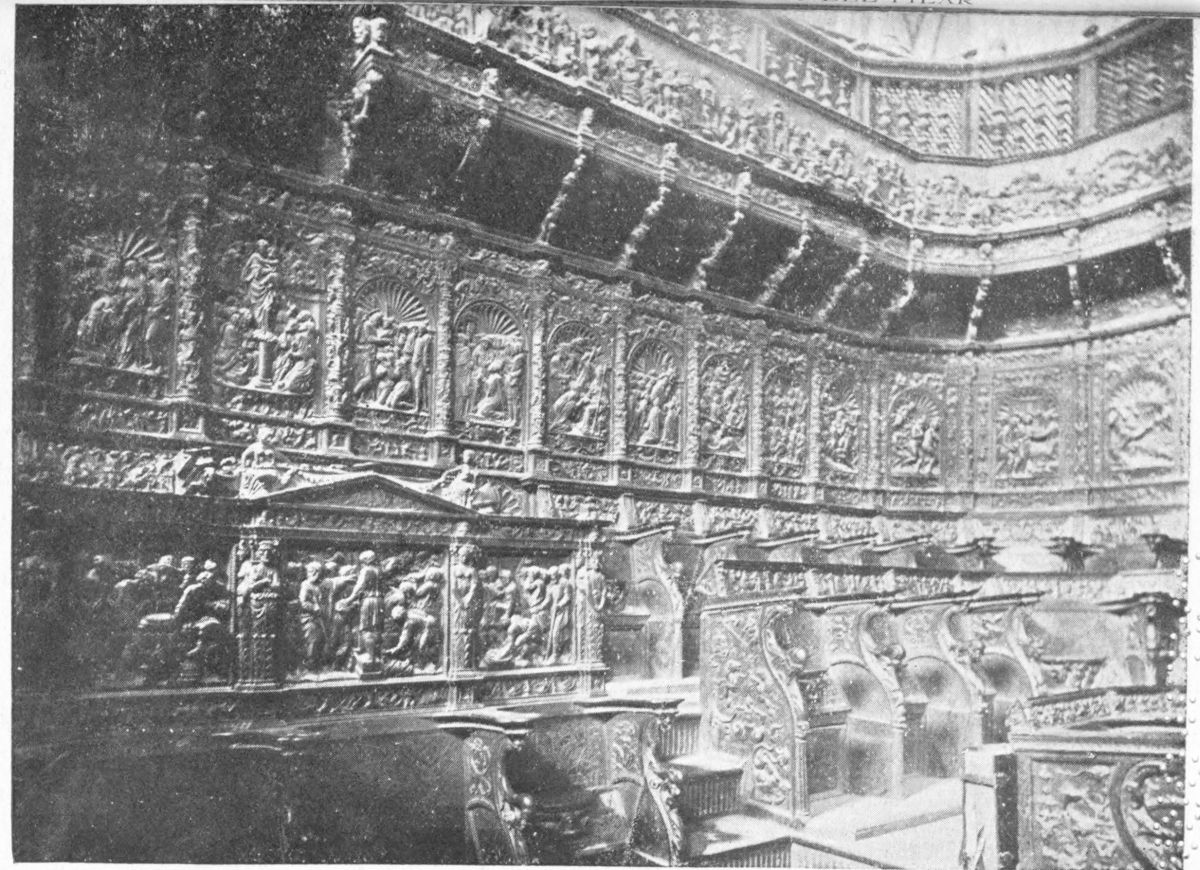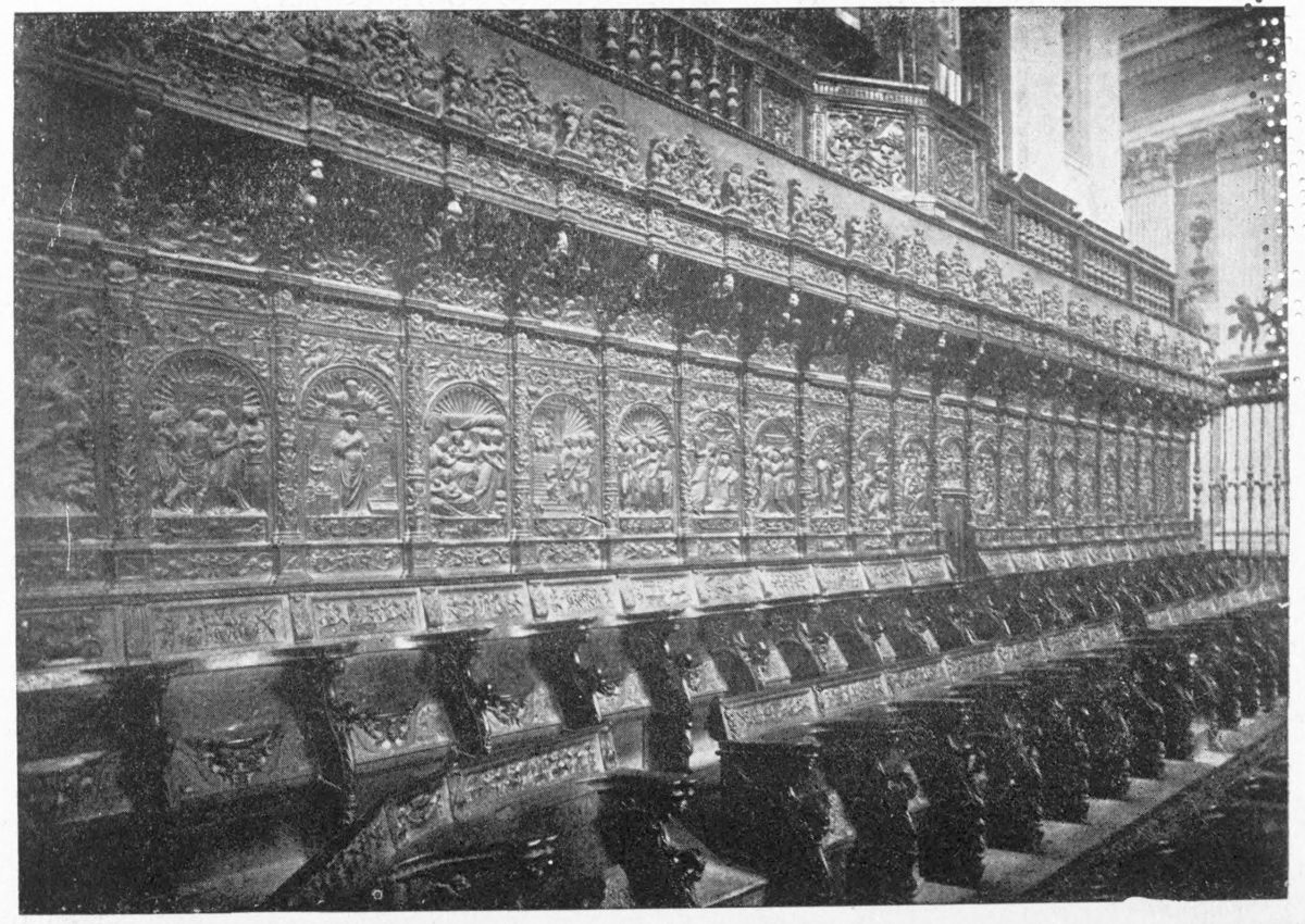 The choir stalls are richly carved with caprices and scenes, ‘ill according,’ remarks a Spanish writer, ‘with the sanctity of the place.’ But the backs of the lower seats bear representations of Biblical characters, which, like the canopies above, are exquisitely carved. The organs are Churrigueresque, and the gorgeous Gothic trascoro is in hardly better taste. The chapels date mostly from the seventeenth and eighteenth centuries, and contain nothing of interest, except the alleged body of St. Eulalia of Merida.