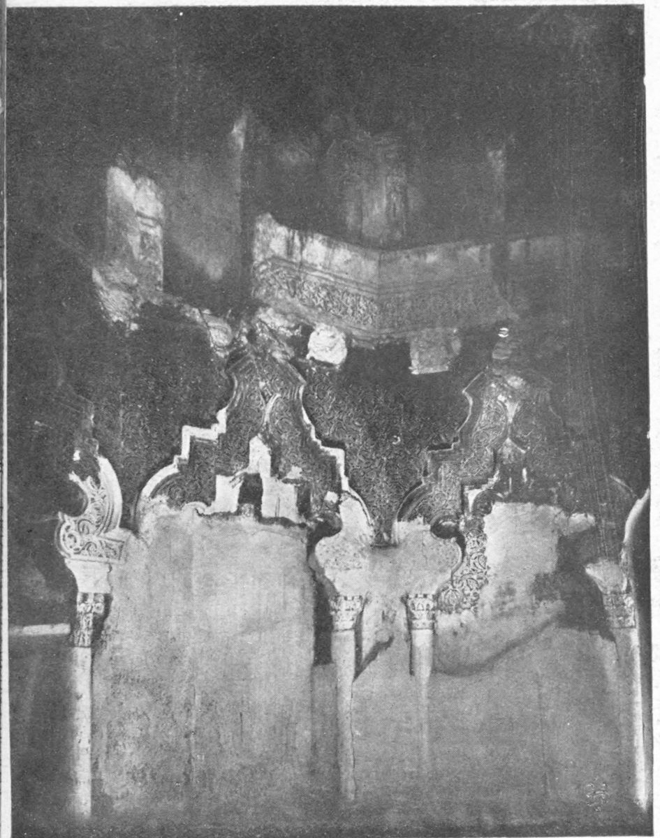 Genuine Moorish work is to be seen in a little octagonal chamber opening off the patio. Of the eight arches, two are in horseshoe shape, and the others formed by irregular and capricious curves. The columns are almost hidden in the walls. The ceiling is modern, and unfortunately cuts off the view of the elegant ajimeces and arabesques of the upper stage. The ornamentation recalls that of the Alhambra. This chamber—said by some, on no particular authority, to have been a mosque—was the seat of the Inquisition down to 1706. The guide points out a cell called La Torreta, in which—according to Verdi’s opera Il Trovatore—Manrico was confined. The opera is founded on a legend of Zaragoza, and the libretto was written by Garcia Gutierrez, a native of the city.