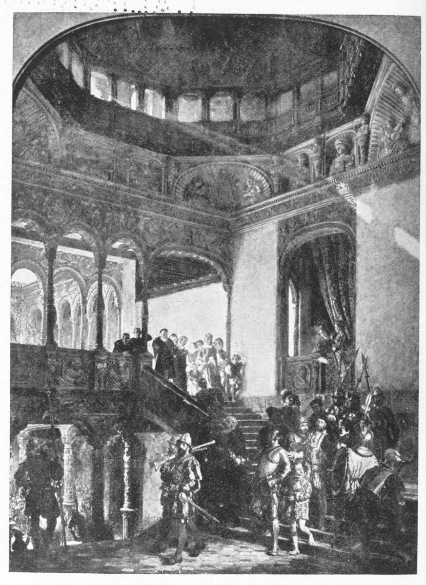 A minor Puerta del Sol, Ford calls this regular, symmetrically planned open space, designed after{15} the great fire of 1561 by Francisco Salamanca. The houses enclosing it are of uniform architecture, with three tiers of balconies in the three Grecian orders, capable, it is said, of accommodating 24,000 spectators. The portico is supported by massive granite columns of a bluish tinge, each a monolith. On the north side is the ungraceful Ayuntamiento (Town Hall), with weather-vanes on its towers and martial trophies surmounting the town clock. The space is as lively and gay as any in Spain. The sun shines brightly, the birds fly as freely overhead as across the innocent plains; here there is no deeper shadow than elsewhere, no abiding gloom or ghostly chill. Yet if ever a spot deserved to be called accursed it is this. Let us project ourselves back into the past, to a bright morning in May in the year 1559. The balconies have not yet been built, but stands and tiers of seats have been constructed round the Plaza. There is a grand display of bunting, and the richest draperies are hung from the crowded windows—silks and cloth of gold and silver, damasks and brocades. On a daïs are seen the little prince, Don Carlos, and his aunt the Infanta Juana. The civic dignitaries of the town are here, the craftsmen in their liveries; but making{16} the bravest show of all are the bishop and the clergy, arrayed in full canonicals, as befits the solemn Act of Faith at which they are about to assist. The square is packed with a vast multitude—men have come from far and near to see this thing—and people are pouring down the narrow streets, an unceasing stream. All eyes are fixed on the platform in the centre of the Plaza, whereon faggots and brushwood are neatly piled round fourteen pillars, and busy varlets are bestirring themselves. A subdued murmur betokens the approach of the procession. For the alguazils who clear the way, for the horribly clad familiars of the Holy Office who stalk before, the spectators have no eyes: the gaze of those thousands is levelled on the fourteen men and women walking slowly to their awful doom. Were ever creatures so shockingly grotesque? They wear a perfectly ridiculous headgear, like an elongated nightcap, or a hat such as our grenadiers wore in days gone by; a sort of smock covers their bodies, an ugly flame-coloured garment, painted with figures of dancing and grimacing devils. You can hardly restrain a smile. I’ll wager those gallants yonder are cracking some clever jokes at their expense, for the Latin is by nature a wag. We all know who they are, these wretches.{17} Not long before Valladolid was thrilled by the rumour that a Lutheran conventicle had been discovered here in the heart of His Most Catholic Majesty’s capital. A holy woman, suspicious of her husband’s orthodoxy, had followed him one day, found him in the midst of this heretical assembly, and denounced him to the Holy Office. That is the man, Juan Garcia, a goldsmith whom all the townsmen have known and dealt with this many a year. Where’s his wife? somewhere in the crowd, doubtless, praying for his soul. Virtue like hers is worthy of heroines or devils. Most notable of the heretical crew is the Doctor Cazalla, one of the king’s most notable preachers; but the Holy Inquisitors are no respecters of persons. They would drag you from behind the throne. The priest with the Doctor is his brother Francisco. The woman is his sister, Doña Beatriz. Burn a woman? Ay, surely. There are four more, one of them a serving-wench. That black-avised fellow is a mere Jew from Lisbon—there is little sympathy for him. Then there are four gentlemen, and—hold!—one has a gag in his mouth. It is the Bachelor, Antonio Herrerruelo, an obstinate fellow, who will not recede one hair’s-breadth from his heretical opinions or concede one iota. The sixteen that follow{18} interest us less. They have been reconciled with Mother Church, and for them no worse fate is reserved than the confiscation of all their goods and solitary confinement for life. Ha! one of them has fainted. It is the youthful daughter of the Marqués de Alcañias, Doña Ana Enriques. They say that one of this batch is an Englishman. Perhaps he has seen Catholics hanged, drawn, and quartered in his own land, and can forgive the Spaniard.