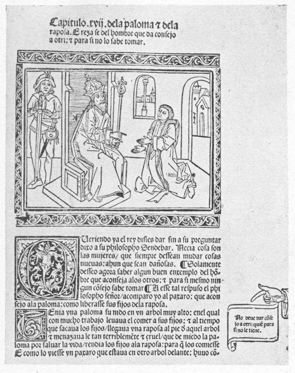 A PAGE FROM THE WORK ENTITLED “EXAMPLE AGAINST THE DECEPTION AND PERILS OF THE WORLD” BY JUAN DE CAPUA. PRINTED IN ZARAGOZA BY PABLO HURUS IN 1493 (NATIONAL LIBRARY)
