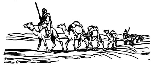 THE BEGINNING of the caravan’s trip was made through lovely country, through regions in which flowers such as tea roses and white and purple iris bloomed. When the caravan came through villages, boys ran out barefoot and half-naked to sell fruit to the travelers: baskets of peaches, pears, and melons. All the forty camels wore bells, each one several little silver-tongued bells attached to the harness he wore around his neck. The youngest camel was the only one who did not carry a bell, nor a load on his back. This was the first trip he had ever made across the desert and he followed close behind his mother. As long as she was there before him, he felt quite pleased with himself and not at all fearful of all the sights he saw.