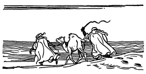 [84]Next came the temptations of salt and tobacco, and the little camel looked at them with longing eyes. For a moment he could not make up his mind what to do, because his mother had always told him since his earliest days that salt and tobacco were so rare and so tasty that never, under any conditions, must he dream of refusing them. She said they were part of the daily fare of rajahs and pashas and kings, and if a poor camel ever had the luck to get near them, he should snatch them up as quickly as he could.