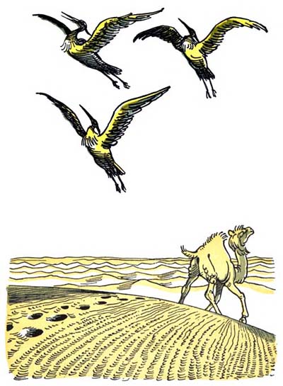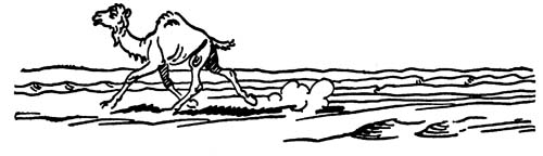 THE NEXT morning the youngest camel awoke in high spirits and ran quickly to brush his teeth in the oasis pool. He felt so reckless that he swallowed all his toothbrush water on purpose, a thing his mother had told him particularly he should never do. Then he gargled so loud that nobody could hear the waterfall any more; so loud, in fact, that the mules craned their heads around and looked critically over their shoulders at him. Next he caught sight of a group of melancholy waders, some of them looking in the water for frogs and some of them standing mournfully on one leg in the shallows. So he crept along behind the bushes[10] and then jumped out at them with such a shout that he scared them into fits before they collected themselves enough to spread their wings and fly away.