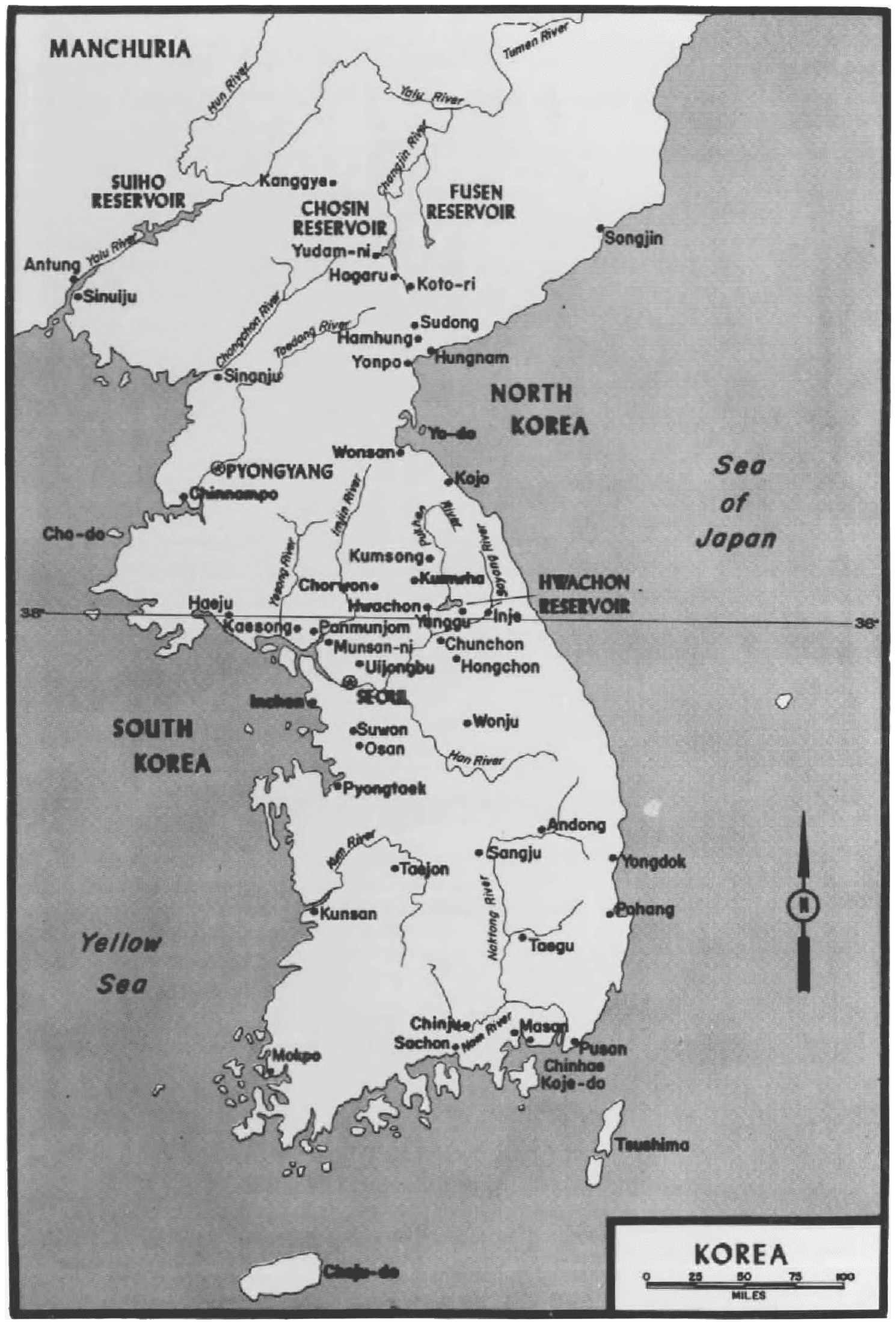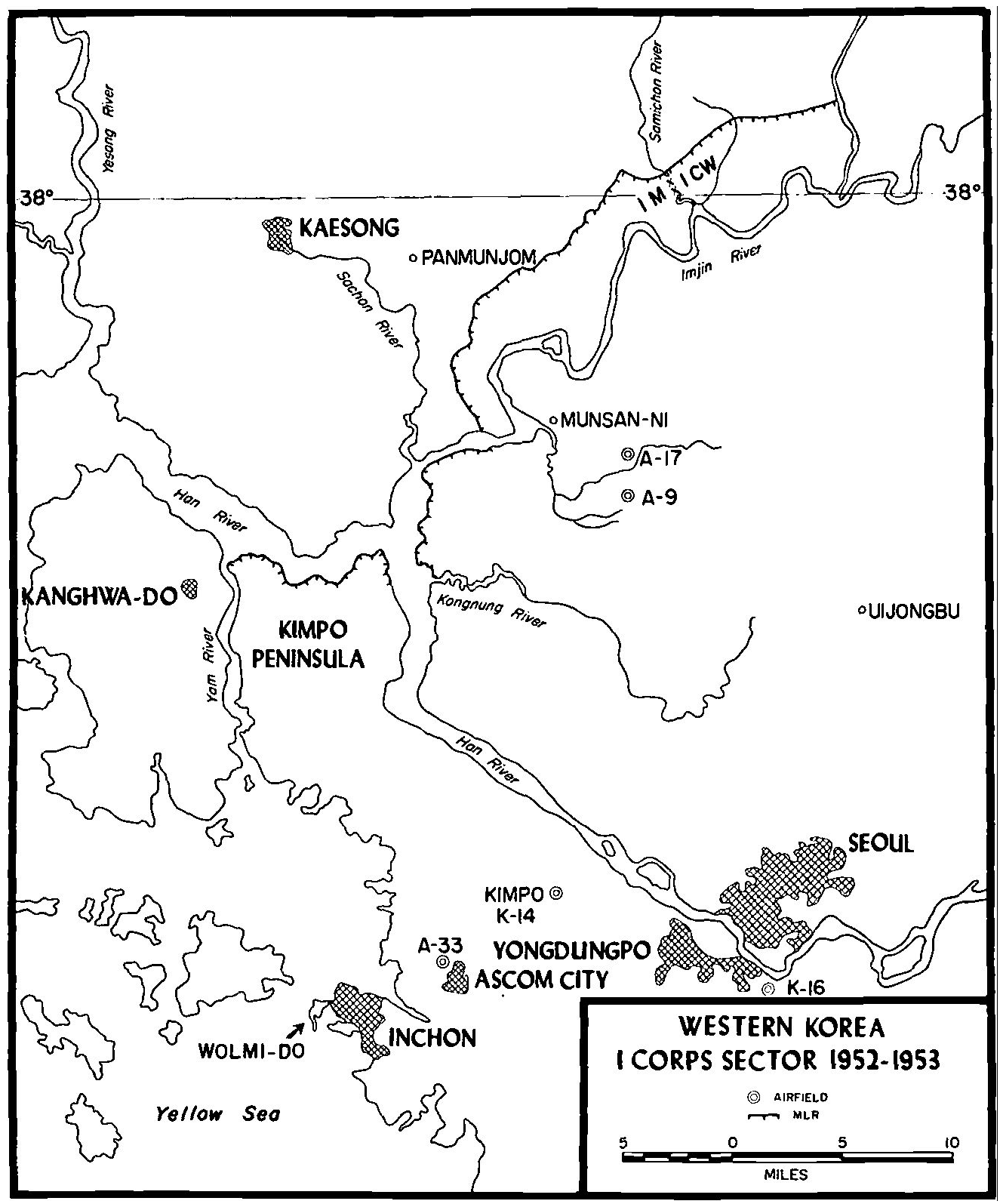 | From Cairo to JAMESTOWN—The Marines’ Home in West Korea—Organization of the 1st Marine Division Area—The 1st Marine Aircraft Wing—The Enemy—Initial CCF Attack—Subsequent CCF Attacks—Strengthening the Line—Marine Air Operations—Supporting the Division and the Wing—Different Area, Different Problem | ||