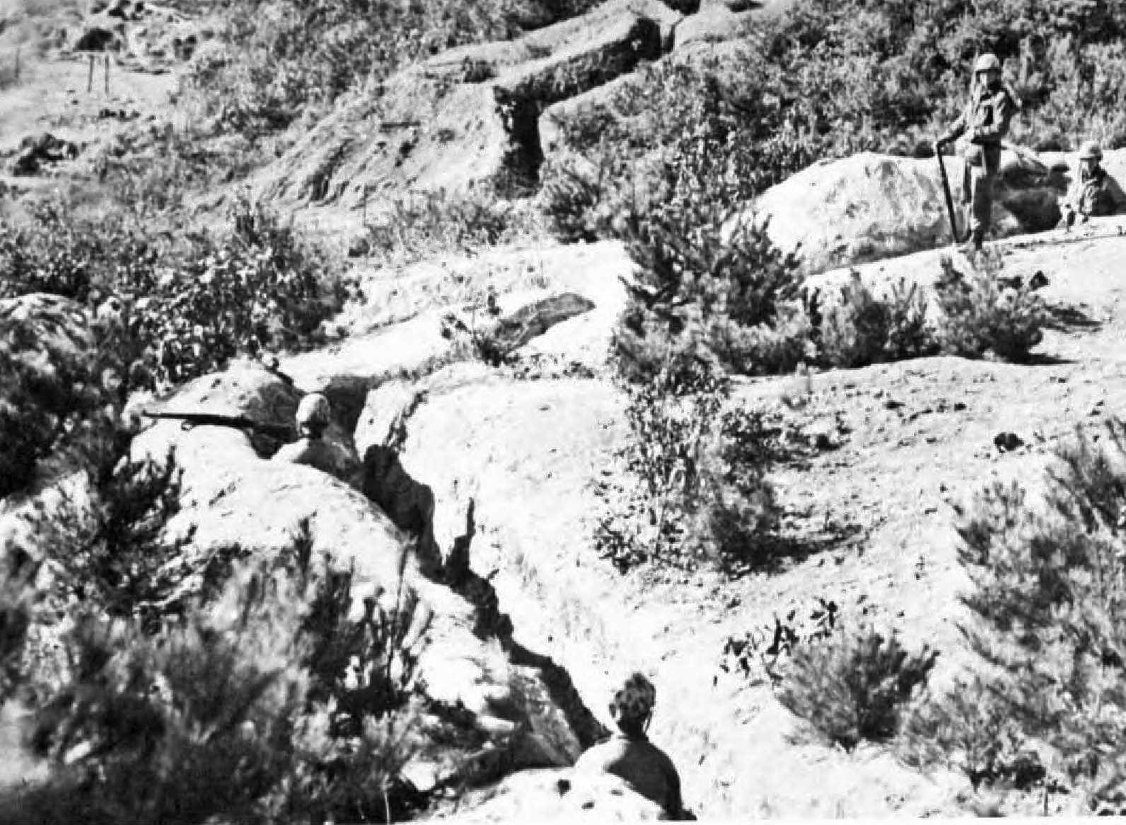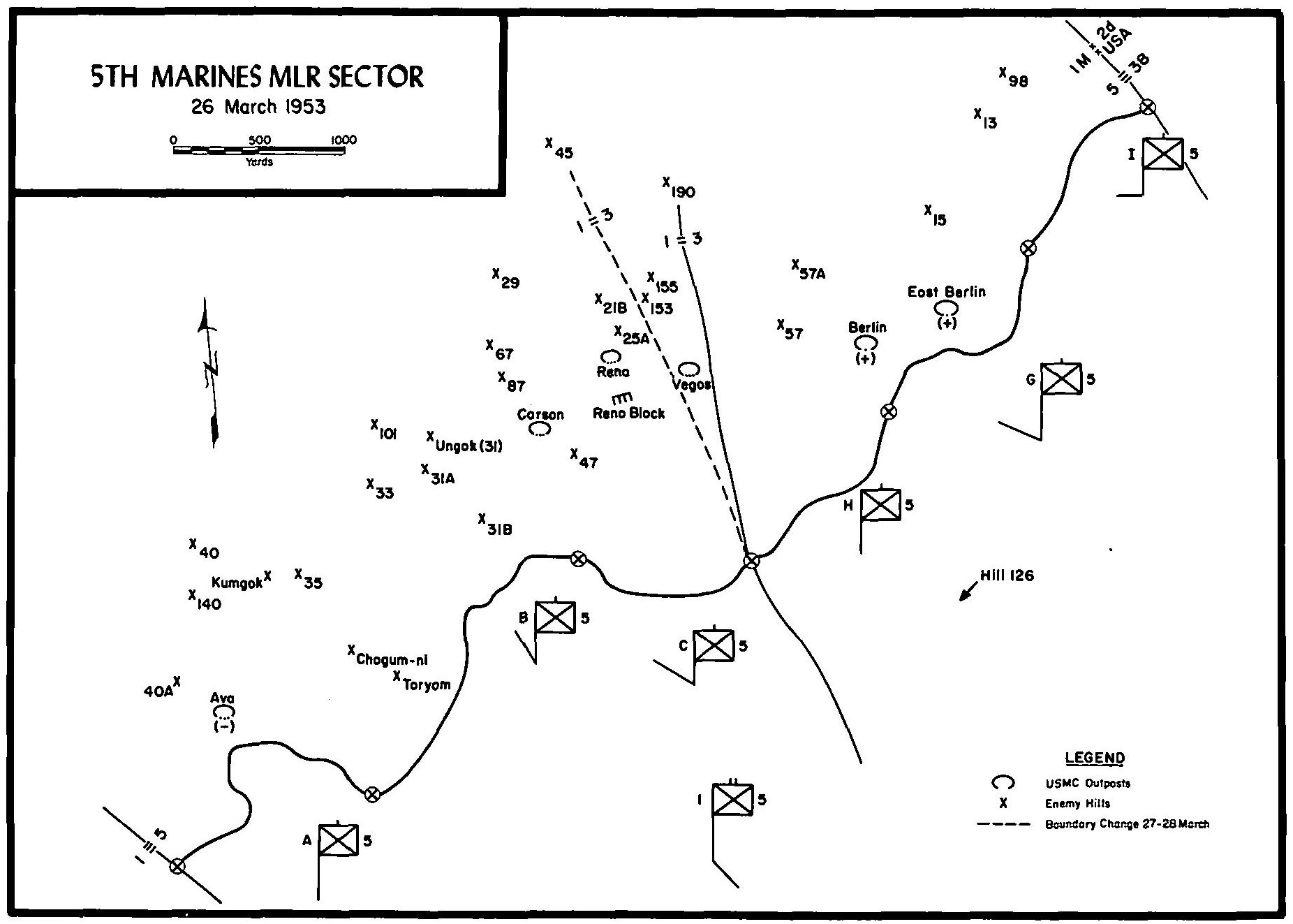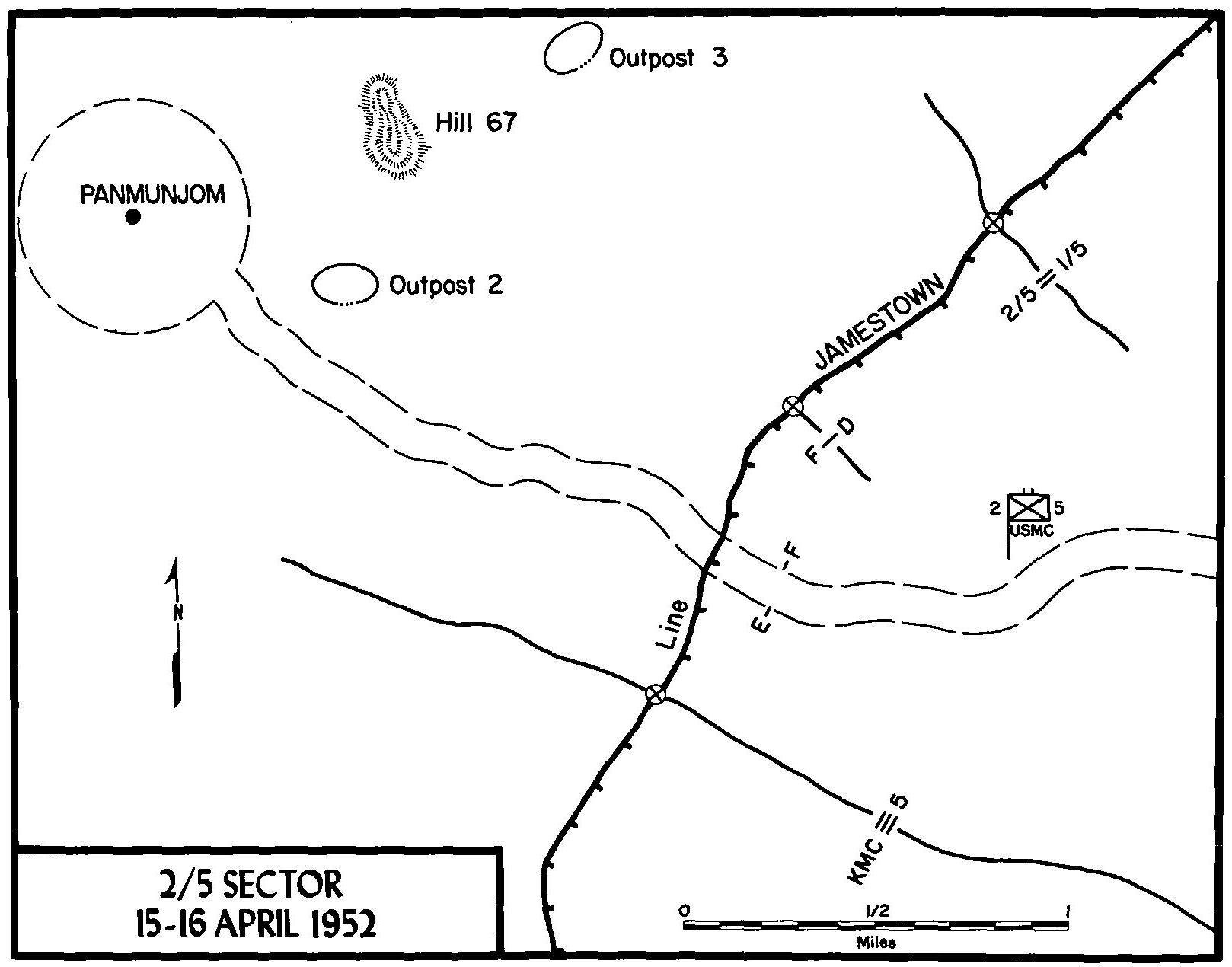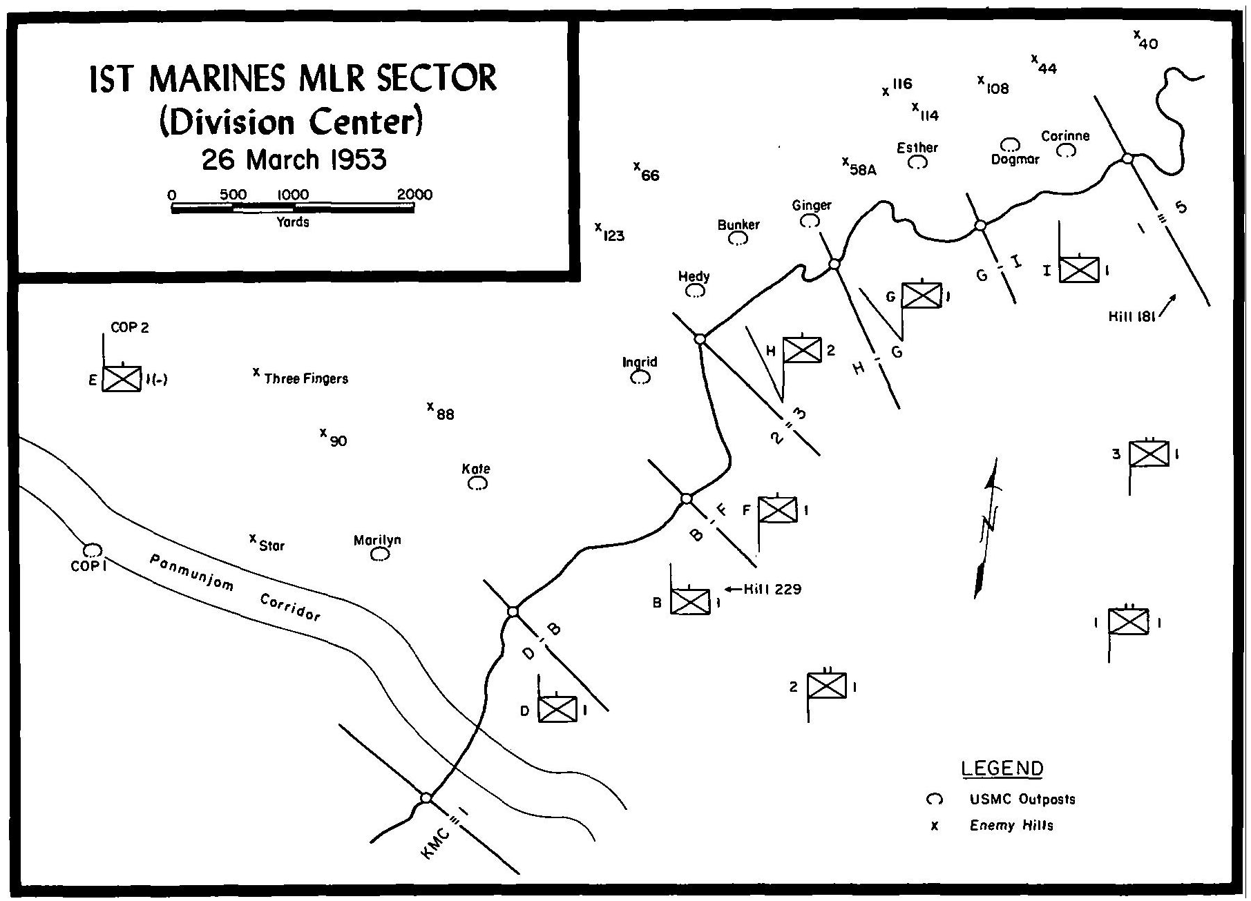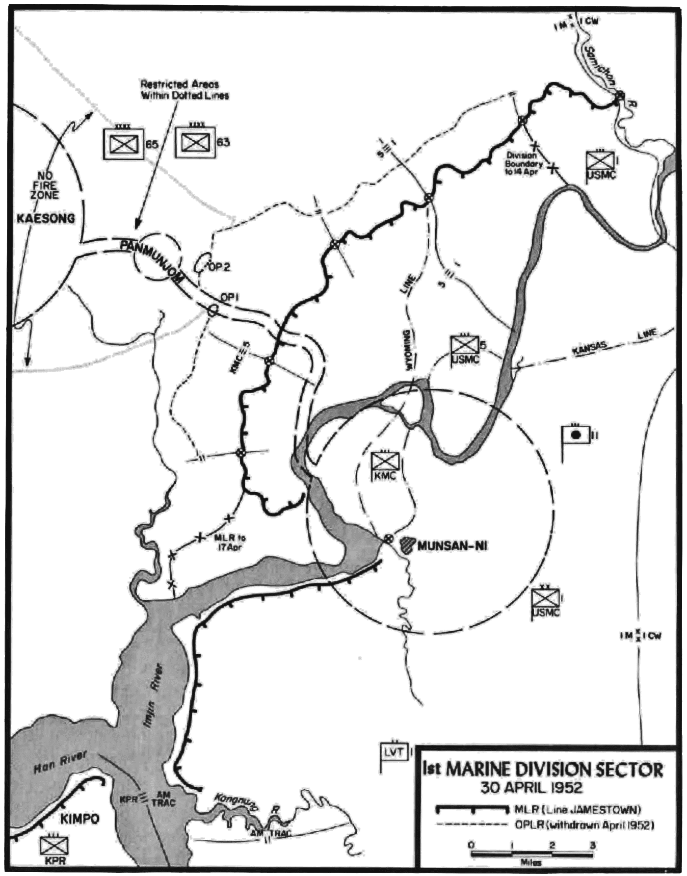 In March 1952 the 1st Marine Division redeployed from the East-Central front to West Korea. This new sector, nearly 35 miles in length, anchored the far western end of I Corps and was one of the most critical of the entire Eighth Army line. Here the Marines blocked the enemy’s goal of penetrating to Seoul, the South Korean capital. Northwest of the Marine Main Line of Resistance, less than five miles distant, lay Panmunjom, site of the sporadic truce negotiations.