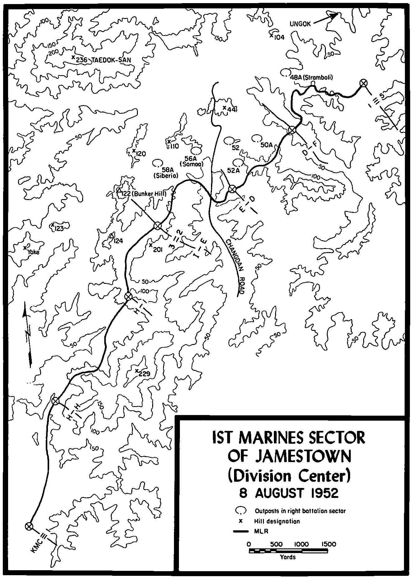 | 9 | 1st Marines Sector of JAMESTOWN (Division Center)—8 August 1952 | 110 |