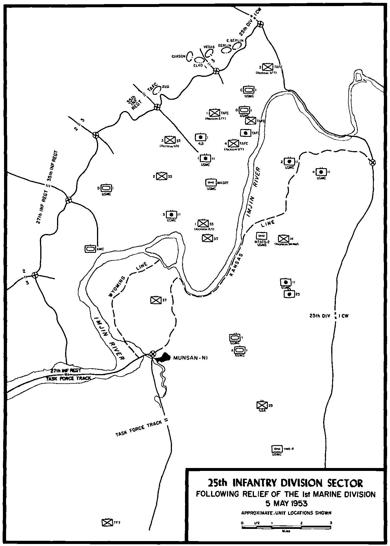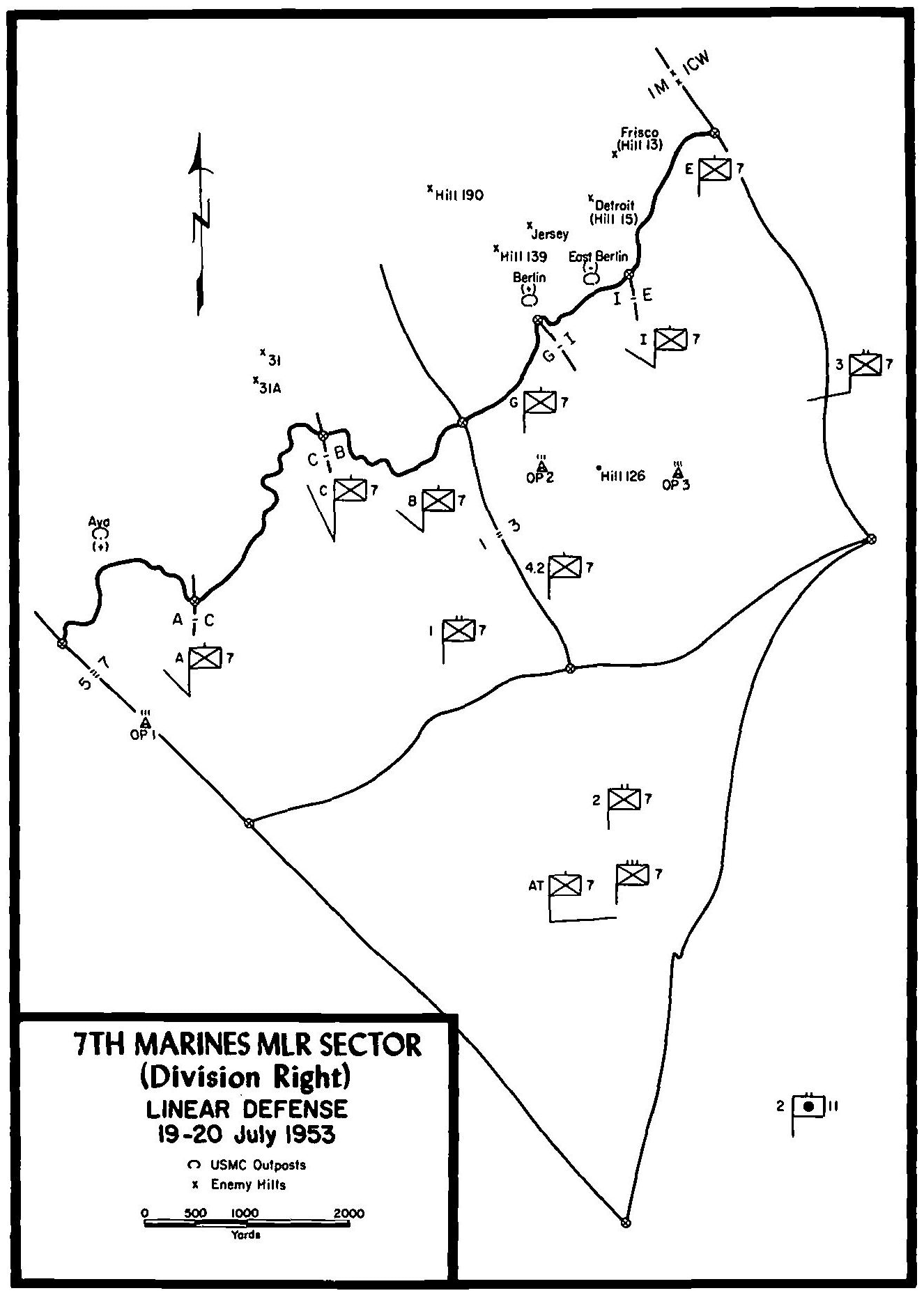 | Relief of the 25th Division—Initial Attacks on Outposts Berlin and East Berlin—Enemy Probes, 11–18 July—Marine Air Operations—Fall of the Berlins—Renewal of Heavy Fighting, 24–26 July—Last Day of the War | ||