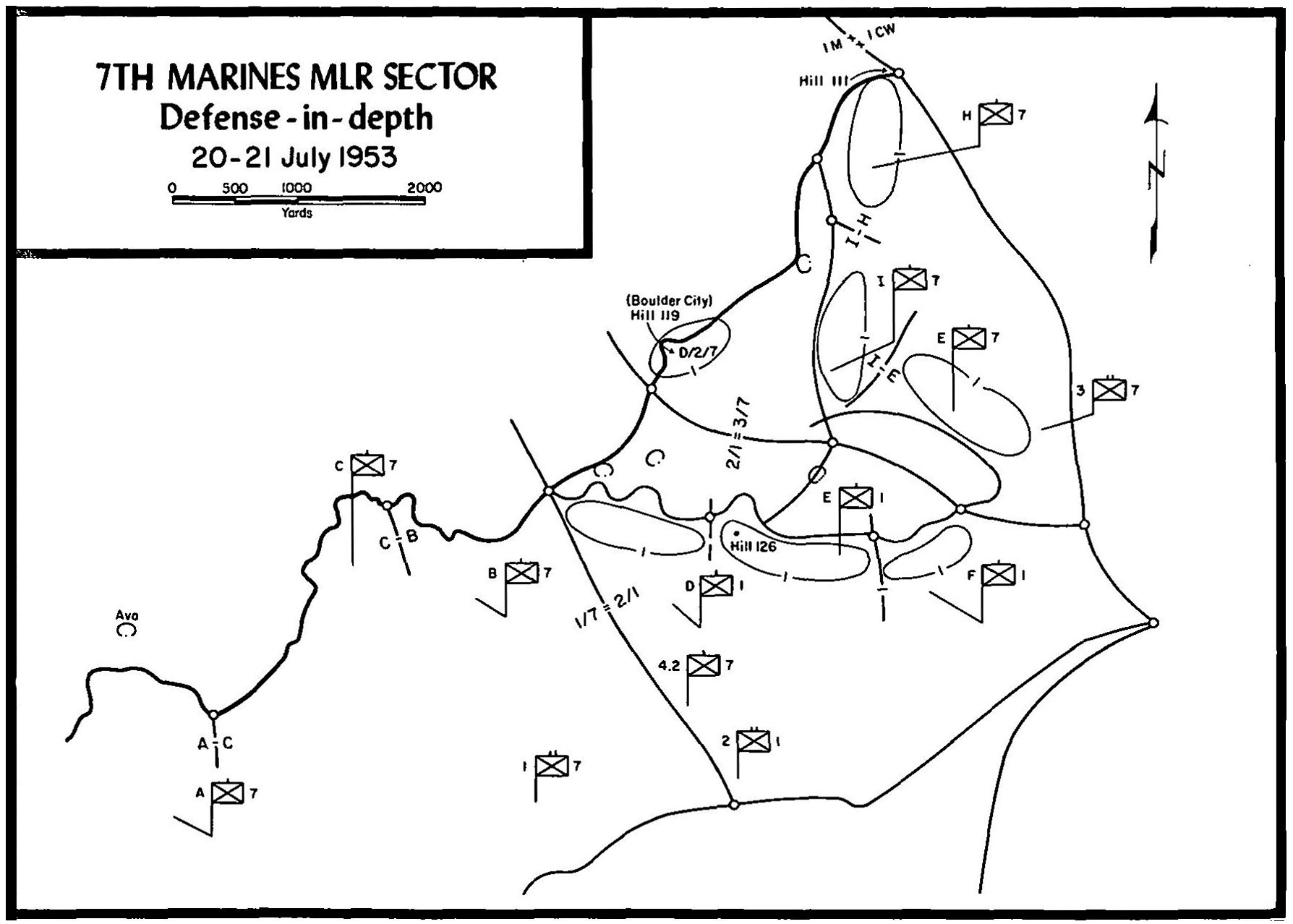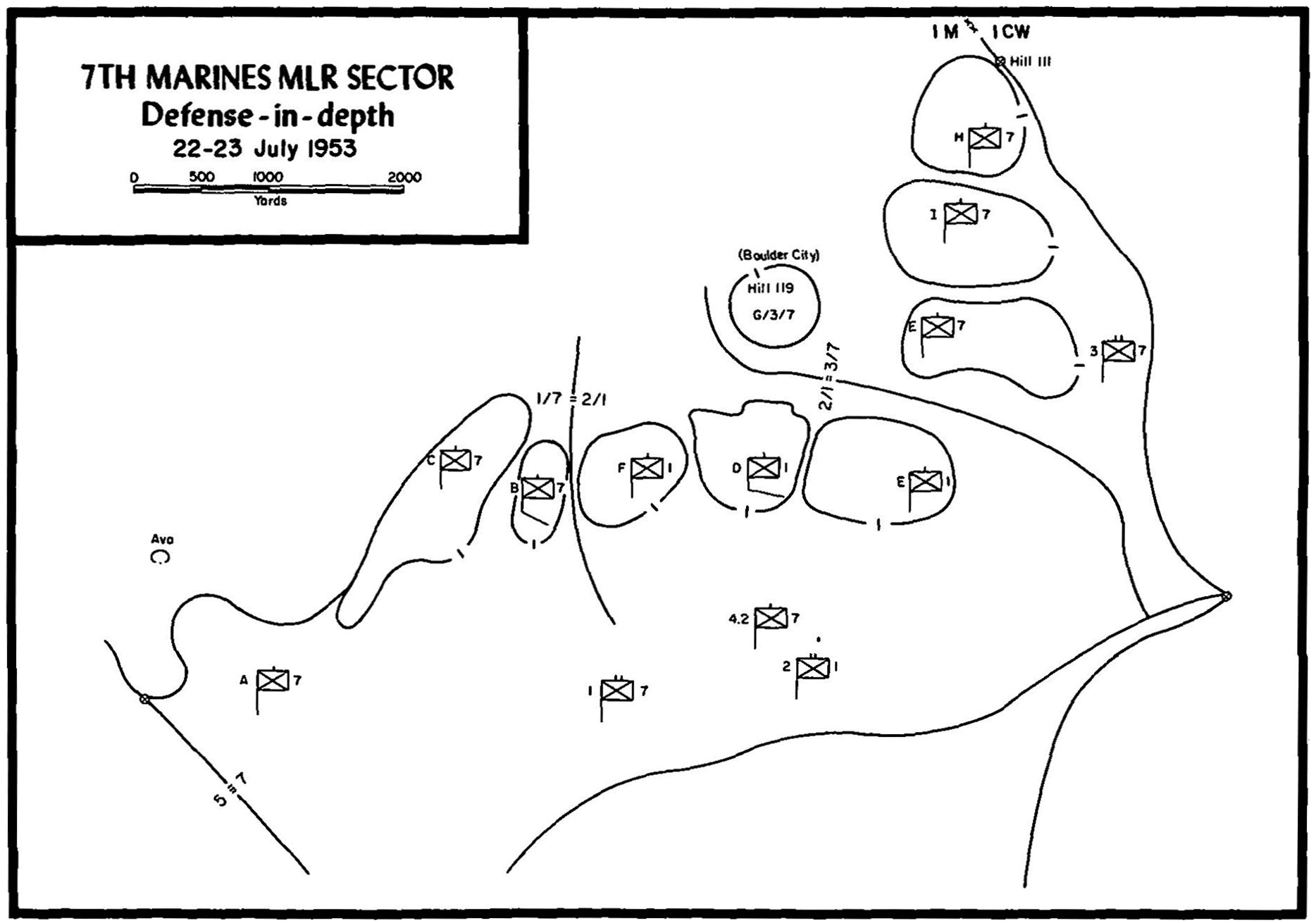 Defense of their strategic area exposed the Marines to continuous and deadly Communist probes and limited objective attacks. These bitter and costly contests for key outposts bore such names as Bunker Hill, the Hook, the Nevadas (Carson-Reno-Vegas), and Boulder City. For the ground Marines, supported by 1st Marine Aircraft Wing squadrons, the fighting continued until the last day of the war, 27 July 1953.