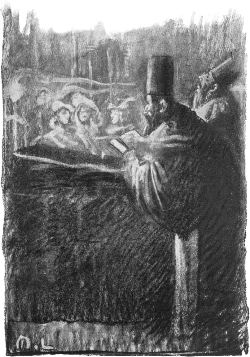 A házmesterrel jött felfelé a klinika szolgája. Mit keres ez itt? kérdezték maguktól egy pillanatra. Aztán nem kérdezték többé, meggémberedve várták, mint jön mind-mind közelebb a sötétzöld ruhás, ezüst-zsinóros ember, azon a havas nyomon, a hol Jisbi Bénob lóbálódzott előre hatalmas csontjaival, gyermekre szabott kis télikabátjában még egy pár nappal előbb – utoljára.