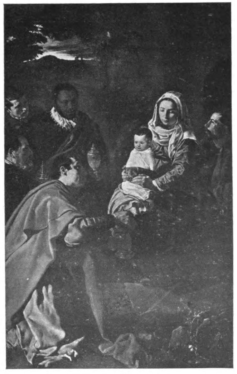 The teaching of Pacheco, his artistic maxims, crystallised from the pseudo-classicism which was then fashionable, made no impression on the temperament and natural tendencies of the young man, who had already devoted himself to the faithful interpretation of nature. No conventions of the studios; no embellishment of the rude form which the living model offers to the vision of a soul that often aspires to some higher ideal; to follow nature as she reveals herself to his eyes, without conventionalising or falsifying, such was the principle to which he always remained faithful, and which he was able to observe, thanks to the serene aloofness of his artistic temperament and the marvellous correctness of his eye. His first attempts were numerous crayon and colour studies executed with great seriousness. While still in his teens he painted several of those works so remarkable for their realism, for their masterly drawing (which with Velázquez was an innate gift), for their sculptural relief and precision: the Old Woman Frying Eggs (of the Cook collection) and the Seville Water-Carrier (in the possession of the Duke of Wellington). Both these pictures, now in England, show that vigour with which the artist treated popular subjects. Typical of his religious works are the Immaculate Conception, St. John in Patmos, Christ in the House of Martha, all three, like the preceding ones, in England; St. Peter, in a private{23} collection at Madrid; the Adoration of the Magi in the Prado; and Christ with the Pilgrims of Emmaus, which has been recently acquired by an American collector.