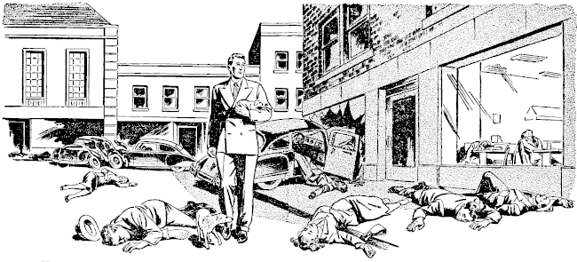"You know, Sandy, if a man didn't go mad from being alone, he could see a lot of things. He could travel anywhere on this continent in a car. If something went wrong, he could get parts out of other cars, get gas out of other tanks. There's plenty of canned food everywhere, 'nough to last a lifetime—a dozen lifetimes. Why, he could walk right into Washington, right into the White House and see how the President lived, or go to Hollywood and see how they used to make pictures, or go to them telescope places and look at the stars. Course, there'd be bodies almost everywhere, but in a year or so they'd be gone, all 'cept the bones which never hurt nobody."