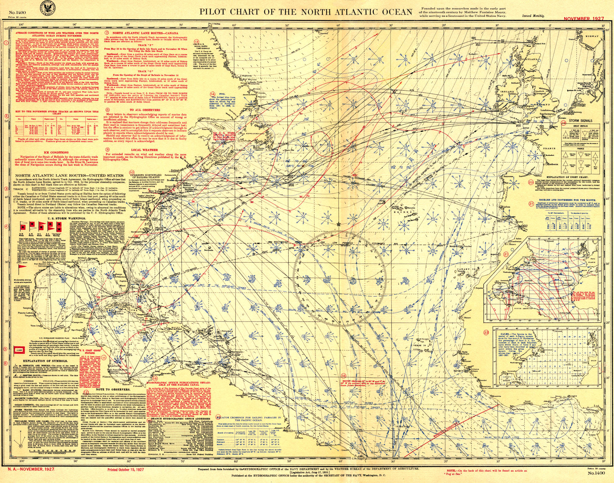Hydrographic Office Publications.—To those mariners who contribute marine data relating to this or other publications of the Hydrographic Office, the Pilot Charts, Notice to Mariners, and Hydrographic Bulletins are given in exchange free of cost. In American ports in which a Branch Hydrographic Office is established mariners of every nationality should call for them in person and receive in addition the latest information regarding charts, sailing directions, dangers to navigation, etc. All services free. Office hours 9 a.m. to 4.30 p.m. To other American ports and to foreign ports the Pilot Charts will be forwarded by mail upon application to the Hydrographic Office or to the nearest Branch Hydrographic Office. In such cases state clearly for which ocean and for which months they are desired and the post-office address to which they should be sent.