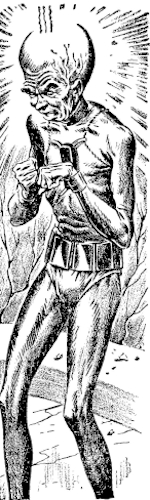 It was then that the bald man caught the thought beam that came through the sphere: "I've got it! Thinking about hair reminded me of the twentieth century man—he destroyed himself and the world with fissionable hydrogen—only he didn't really destroy himself! Do you get it? He only changed things.