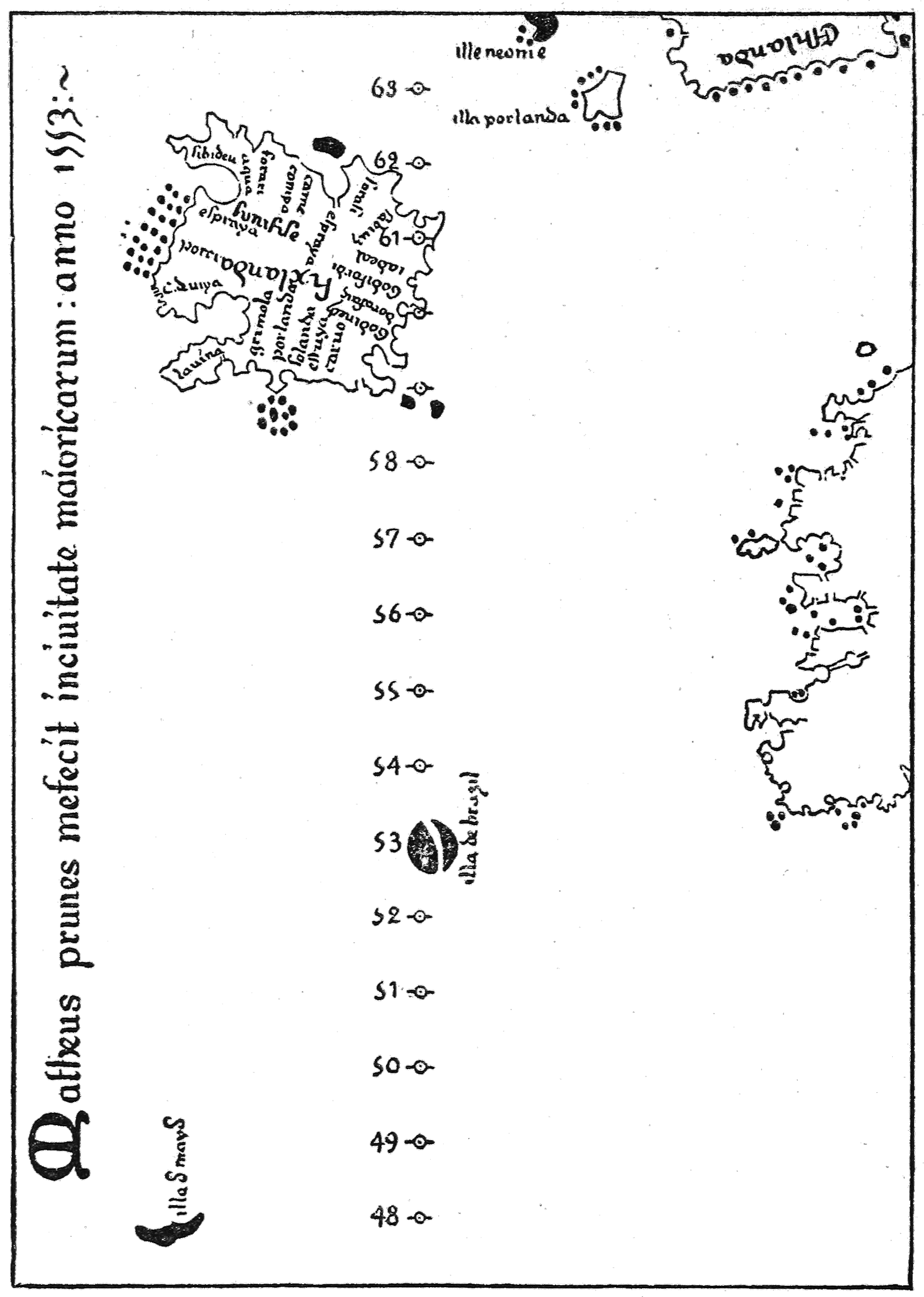Ireland was never subject to Rome, though influenced by Roman trade and culture. From prehistoric times the Irish had done some sea roving, as their Imrama, or sea sagas, attest; and this roving was greatly stimulated in the first few centuries of conversion to Christianity by an abounding access of religious zeal. Irish monks seem to have settled in Iceland before the end of the eighth century and even to have sailed well beyond it. There are good reasons for believing that they had visited most of the islands of the eastern Atlantic archipelagoes. We cannot suppose that this rather reckless persistency ended there in such a period of expansion. It is quite possible that we owe to this trait the Island of Brazil, in the latitude of southern Ireland, as an American souvenir on so many medieval maps (Ch. IV). It is certain that the “Navigatio” of St. Brendan scattered St. Brandan Islands, real or fanciful, over the ocean wastes of a credulous cartography (Ch. III).