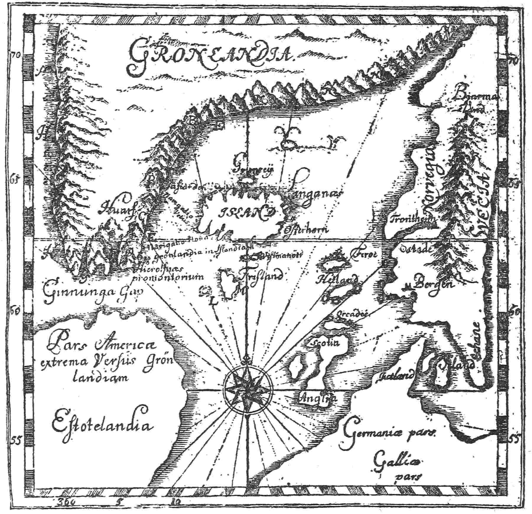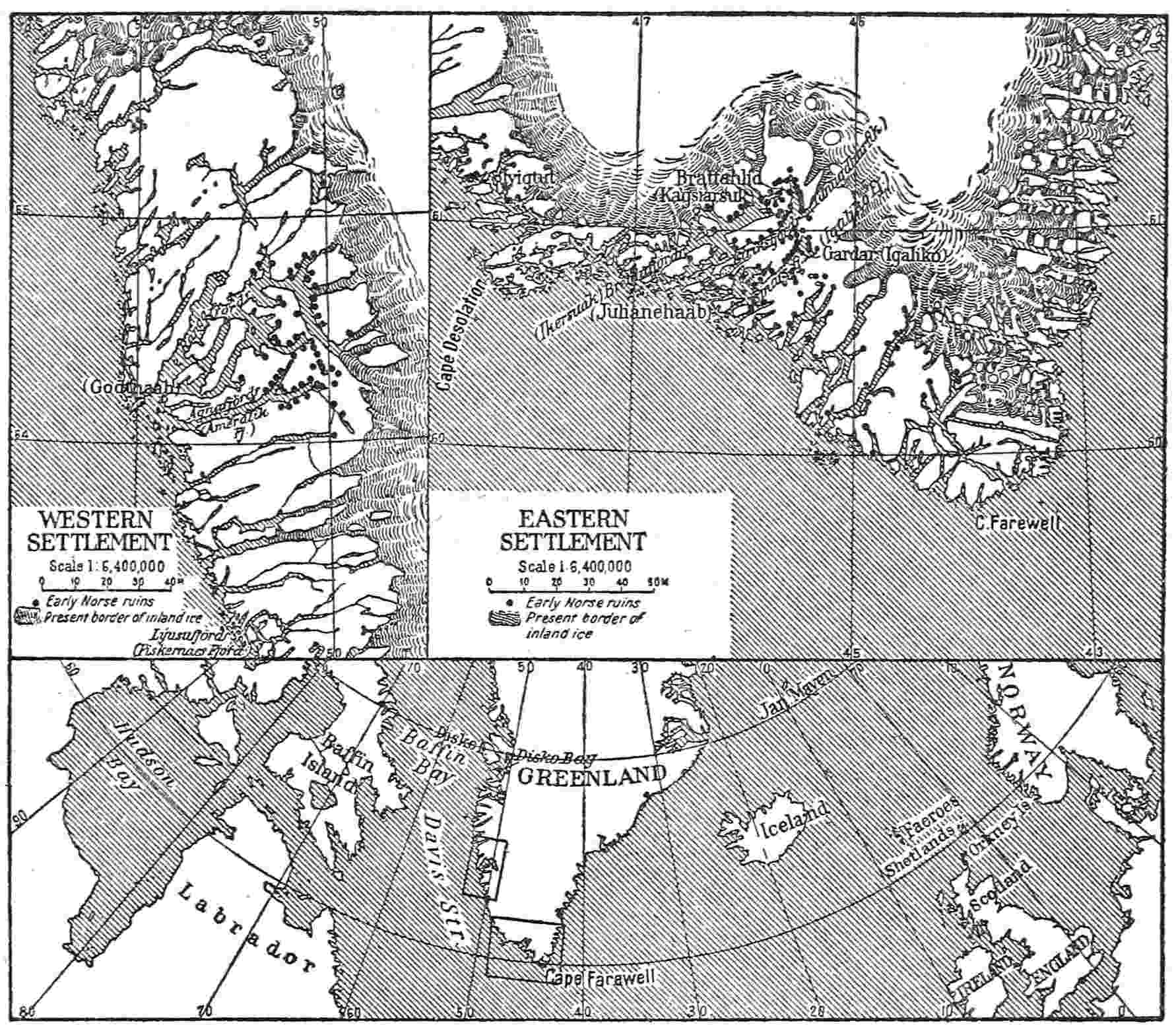 A little later Scandinavians followed along the northern route, finding convenient stopping points in the Faroes and Iceland, discovered Greenland, and planted two settlements on its southwestern shore in the last quarter of the tenth century (Ch. VII). Some of their ruins, a less number of inscriptions, and many fragmentary relics and residua are found, so that we can form a good idea of their manner of life. Such as it was, it endured more than four hundred years. To contemporary and slightly later geography Greenland appeared most often as a far-flung promontory of Europe, jutting down on the western side of the great water;6 but sometimes it was thought of as an oceanic island, with greater or less shifting of location, and seems to be responsible for divers mythical Green Islands of various maps and languages.