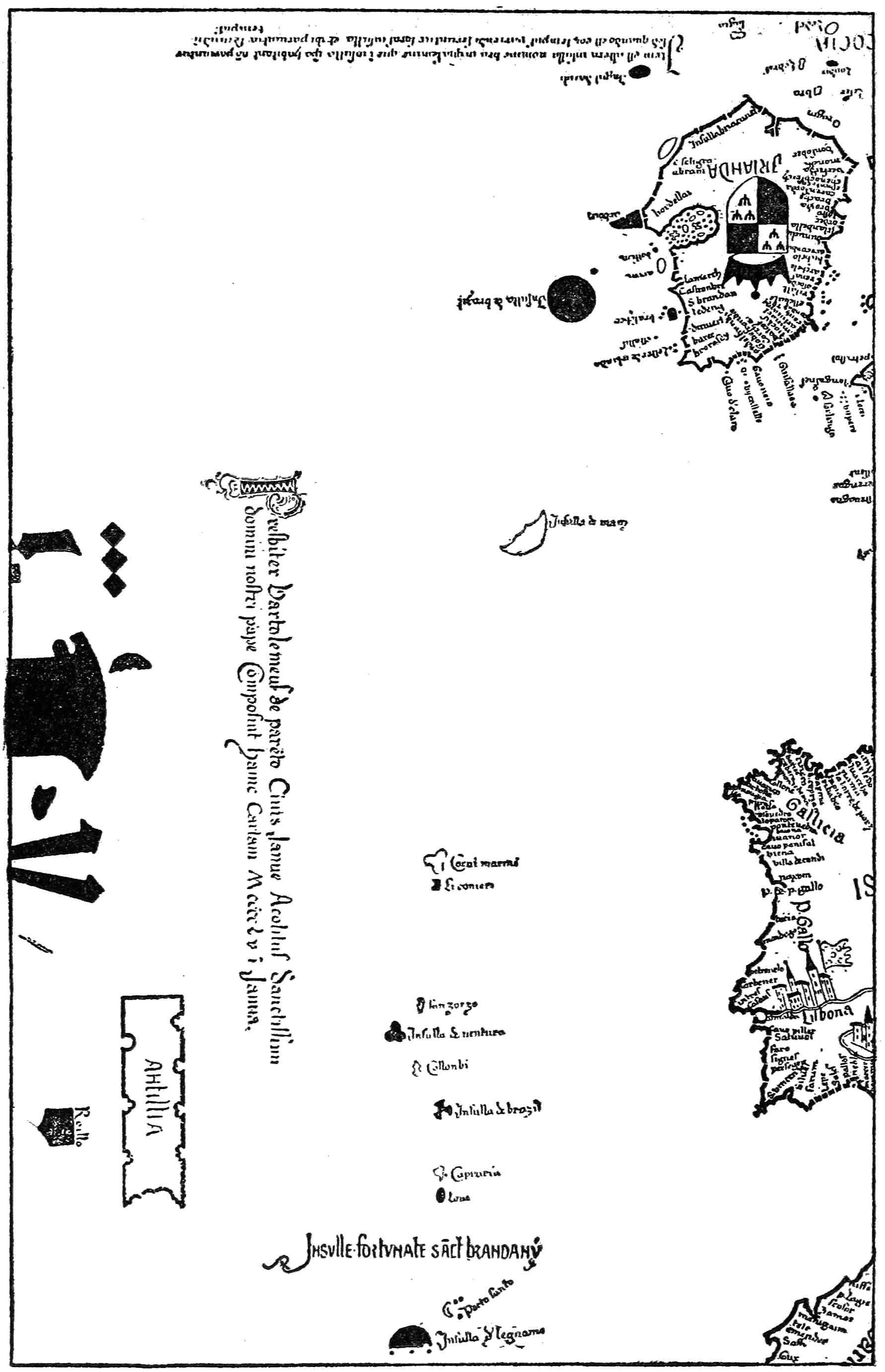 This brings us down to the rise of Portuguese nautical endeavor, which seems to have begun earlier than has generally been supposed but became most conspicuous under the direction of Prince Henry the Navigator. Its achievements included the rediscovery of Madeira and the Azores, which in many quarters had been forgotten, the exploration of the African coast, the accidental discovery or rediscovery of South American Brazil by Cabral, and the voyage of Vasco da Gama to India around the Cape of Good Hope. Perhaps we might insert in the list the discovery of Antillia. At any rate, it got on the map with a10 Portuguese name in the first half of the fifteenth century, and several other islands accompanied it. They all certainly seem to be American and West Indian.