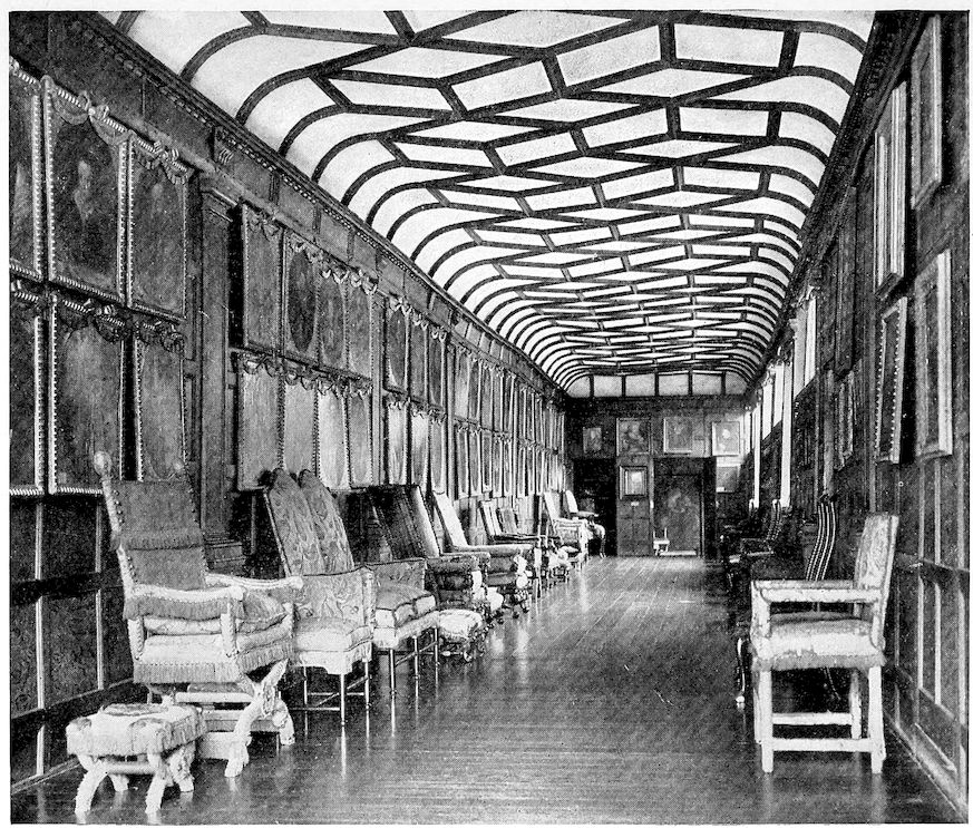11Long and narrow, with dark shining floors, armorial glass in the windows, rich plaster-work ceilings, and portraits on the walls, they are splendidly sombre and sumptuous. The colour of the Cartoon Gallery, when I have come into it in the evening, with the sunset flaming through the west window, has often taken my breath away. I have stood, stock still and astonished, in the doorway. The gallery is ninety feet in length, the floor formed of black oak planks irregularly laid, the charm of which is that they are not planks at all, but solid tree-trunks, split in half, with the rounded half downwards; and on this oak flooring lie the blue and scarlet patches from the stained west window, more subduedly echoed in the velvets of the chair coverings, the coloured marbles of the great Renaissance fireplace, and the fruits and garlands of the carved woodwork surrounding the windows. There is nothing garish: all the colours have melted into an old harmony that is one of the principal beauties of these rooms. The walls here in the Cartoon Gallery are hung with rose-red Genoa velvet, so lovely that I almost regret Mytens’ copies of the Raphael cartoons hiding most of it; but if, at Knole, one were too nicely reluctant to sacrifice the walls, whether panelled or velvet-hung, then all the pictures would have to be stacked on the floor of the attics. The same regret applies to the ball-room, where the Elizabethan panelling—oak, but originally painted white, turned by age to ivory—is so covered up as to be unnoticeable behind the Sackville portraits of ten generations. Fortunately, the frieze in the ball-room cannot be hidden. It used to delight me as a child, with its carved intricacies of mermaids and dolphins, mermen and mermaids with scaly, twisting tails and salient anatomy, and I was invariably contemptuous of those visitors to whom I pointed out the frieze but who were more interested in the pictures. It always fell to my lot to “show the house” to visitors when I was living there alone with my grandfather, for he shared the family failing of unsociability, and whenever a telegram arrived threatening invasion he used to take the next train to London for the day, returning in the evening when the coast was clear. It mattered nothing that I was every whit as bored by the invasion as he could have been; in a divergence between the wishes of eighty and the wishes of eight, the wishes of eight went to the wall.
