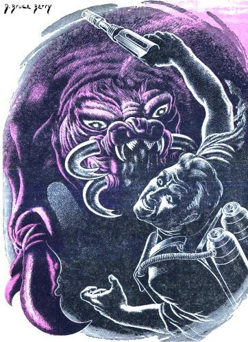 This time he came like two roller-coasters and probably a rocket. I jammed the butt of my spear down solid and shut my eyes. There was a big thud. I opened my eyes. He had run the bar right through him and was still coming, sliding right on down it. There was a hissing and rushing, and clouds of violet vapor spurting from the puncture in him.