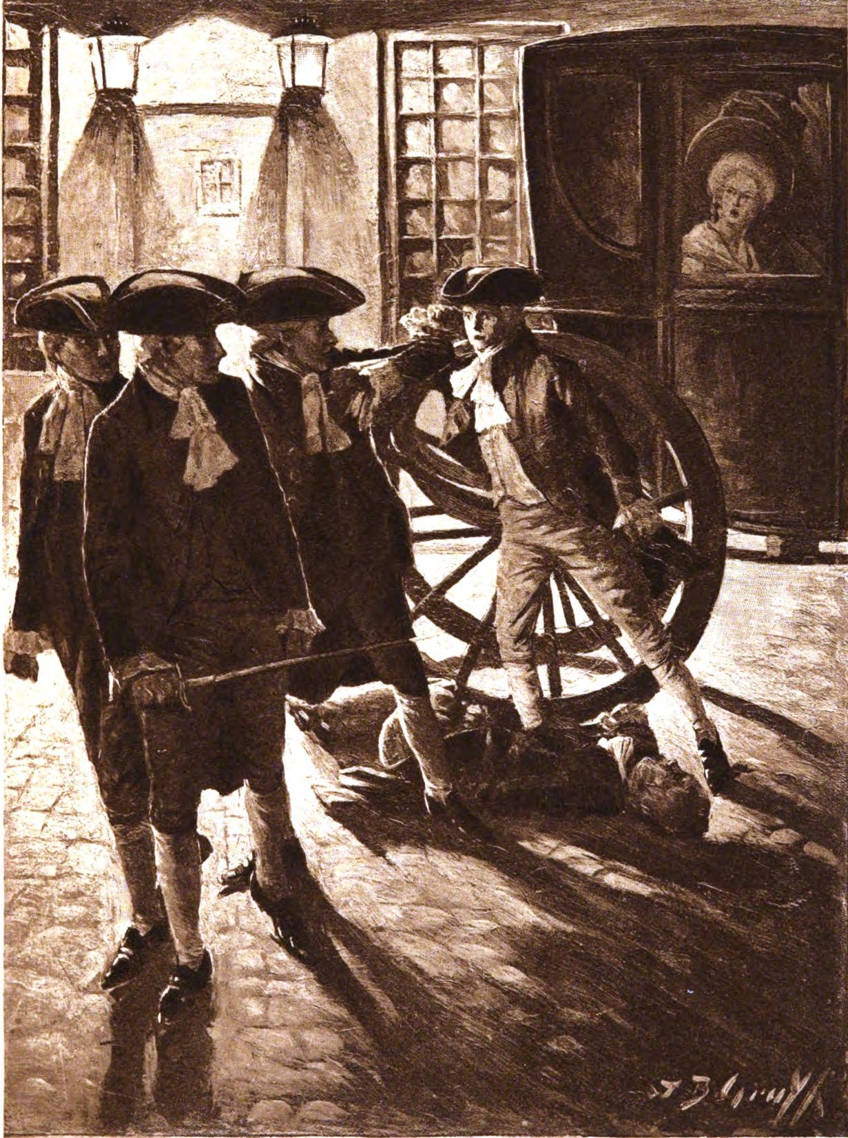 At midnight, Julien, who had been at the door fifteen minutes, entered and found Julie, who also had been waiting fifteen minutes in the pavilion. At the same moment Marcel, Monsieur Antoine, and Madame Thierry entered Paris by the Barrière de Sèvres. Monsieur Antoine's frugal supper and slow conversation had lasted a little too long to suit the widow. Being anxious about her son, she had asked for a seat in the chaise, that she might join Julien at Marcel's.