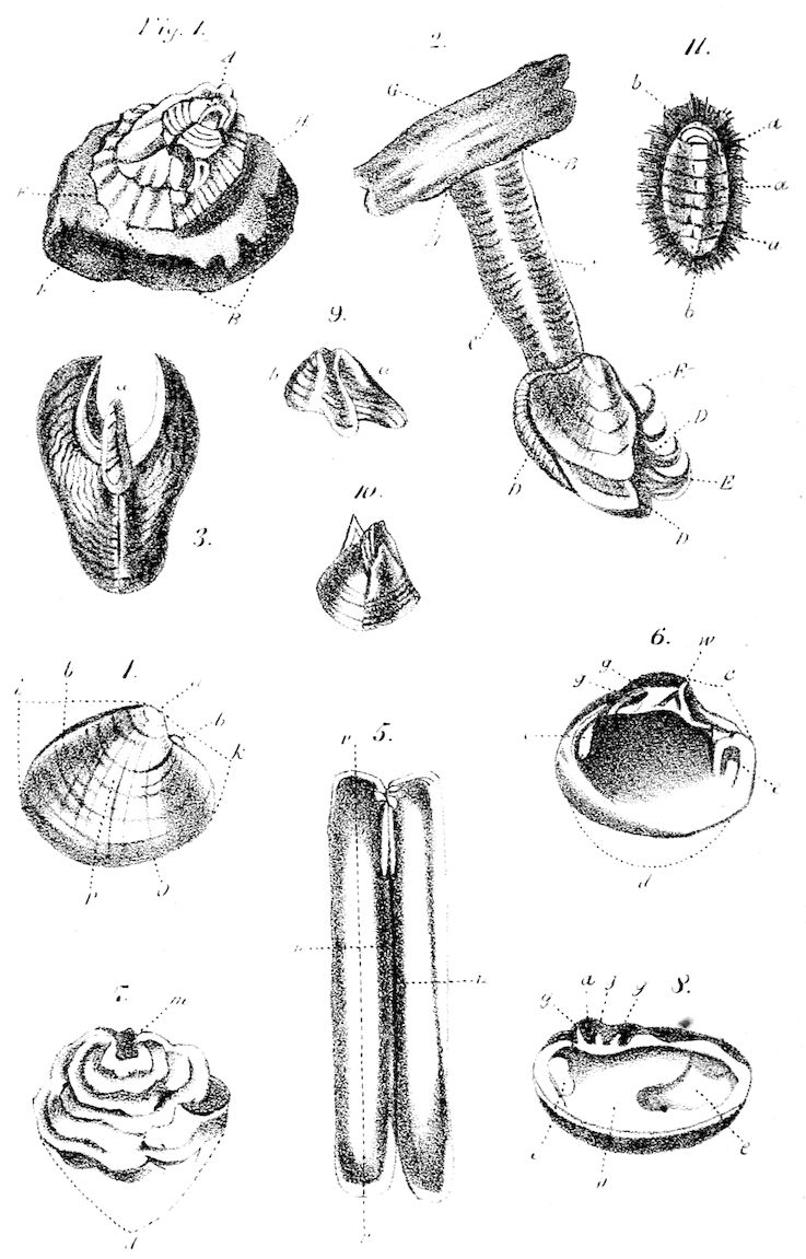 10Feelers are those crenated arms, evolved from the side of the Anatifera. While the animal is in the water it continually moves its feelers, evidently for the purpose of entangling minute marine insects, as food. Plate I. fig. 2, E E.
