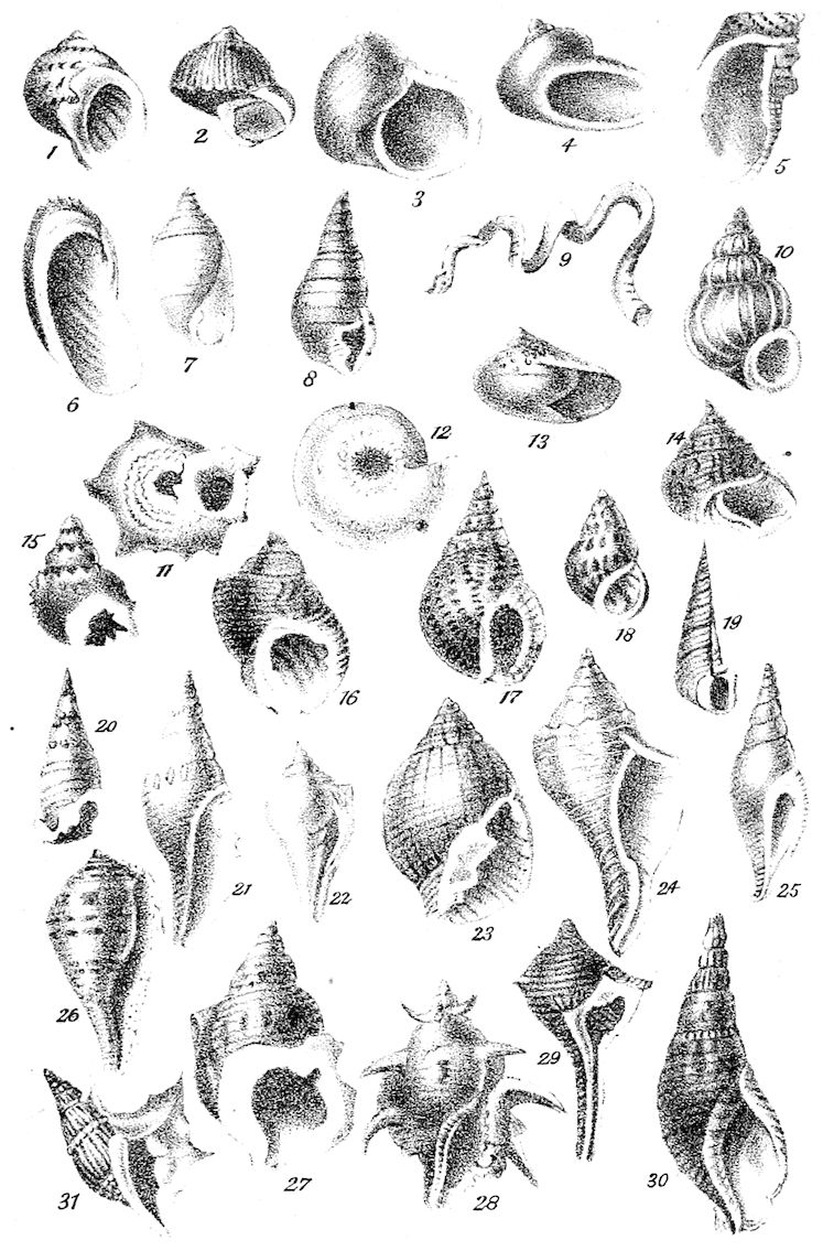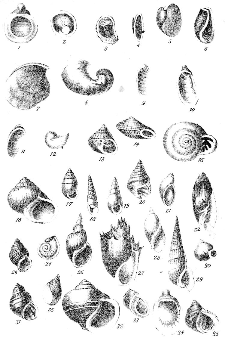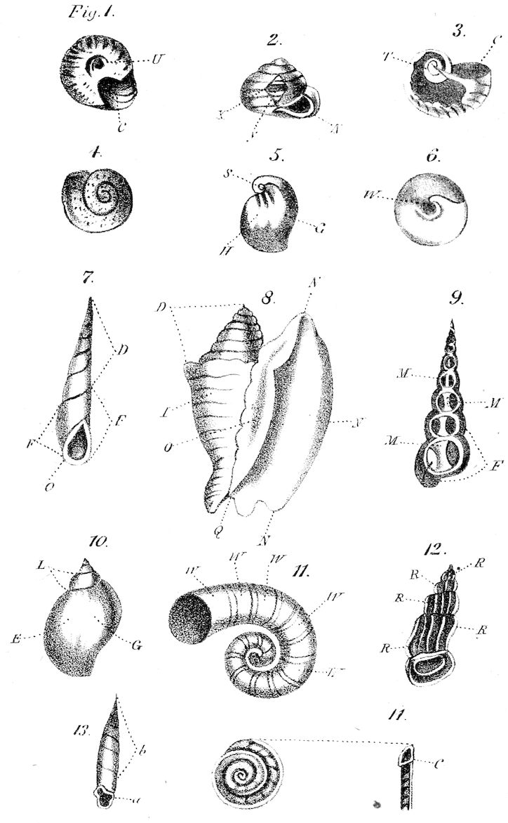The spire is a prominent feature of the Univalve; and upon 17its being elevated, depressed, &c., depends much of the generic and specific definition. Adanson, in his ‘Natural History of Senegal,’ says that the external character of the spire varies according to the plane they turn upon, which, he observes, is either horizontal, cylindrical, conic, or ovoid. At the same time, he admits that there are a great many intermediate forms which cannot properly be defined.