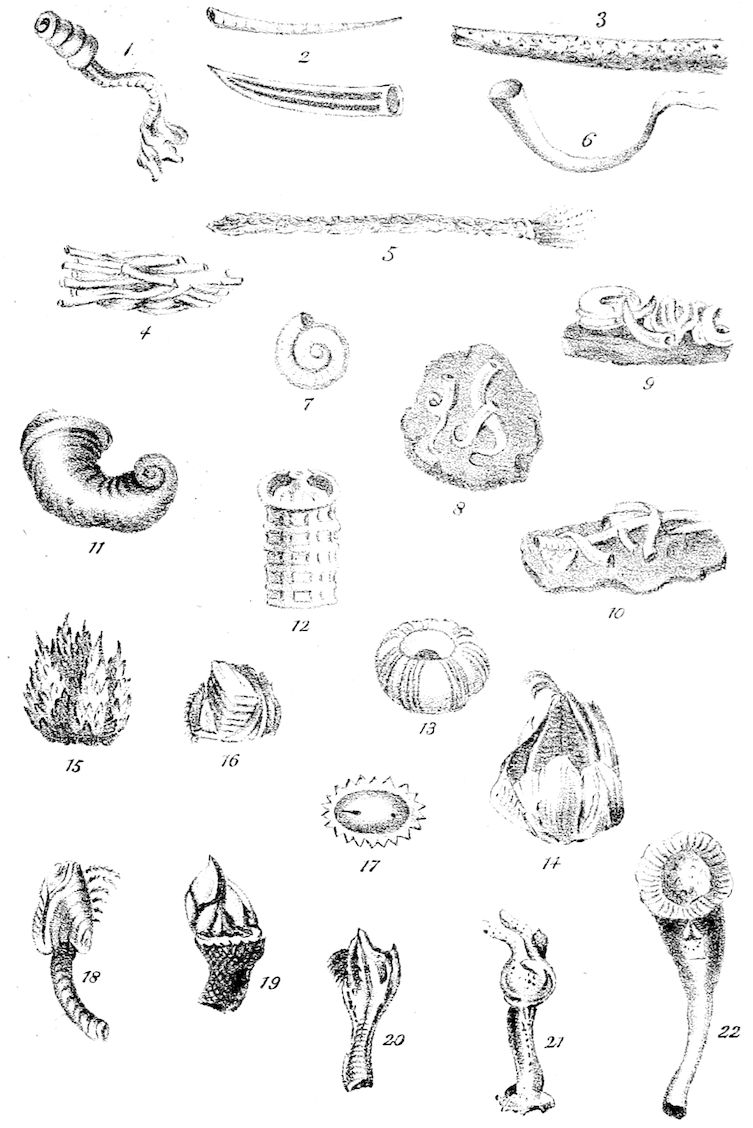 In some of the more depressed species of Helix, or Nautilus, great attention is requisite in order to ascertain which is really the upper side of the shell, for it is on that side the spiral turns are to be taken from the centre or apex; and, in most instances, 18this is to be determined by the oblique direction of the aperture to the under part, where the lip rarely extends so far as on the upper part. In fixed shells, such as Serpulæ, there is no difficulty, as the side which is sessile must be considered as the base or under part. Thus, in the Serpula Lucida the fixed part is sometimes very small, and the mouth turns spirally upwards, in a contrary direction to the sun; and therefore must be considered a reversed or heterostrophe shell, the same as if the volutions nearest the mouth had turned laterally upon the centre or fixed ones. This shell, indeed, is most frequently found with regular lateral volutions; and though subject to great variety, with respect to contortions, it invariably turns the aperture one way.
