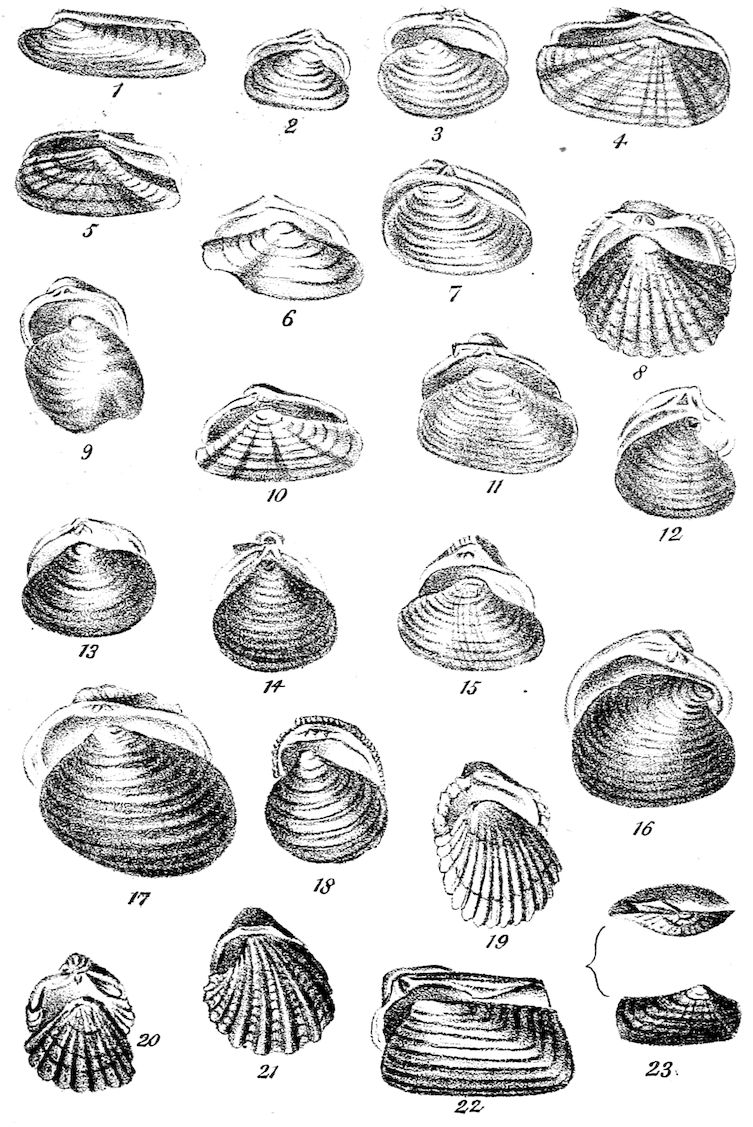 Lunule. The lunated depressions, situated in the anterior and posterior slopes. In different species of Venus they are prominent characteristic marks, often of much service in ascertaining a species. Plate I. fig. 4, b b.