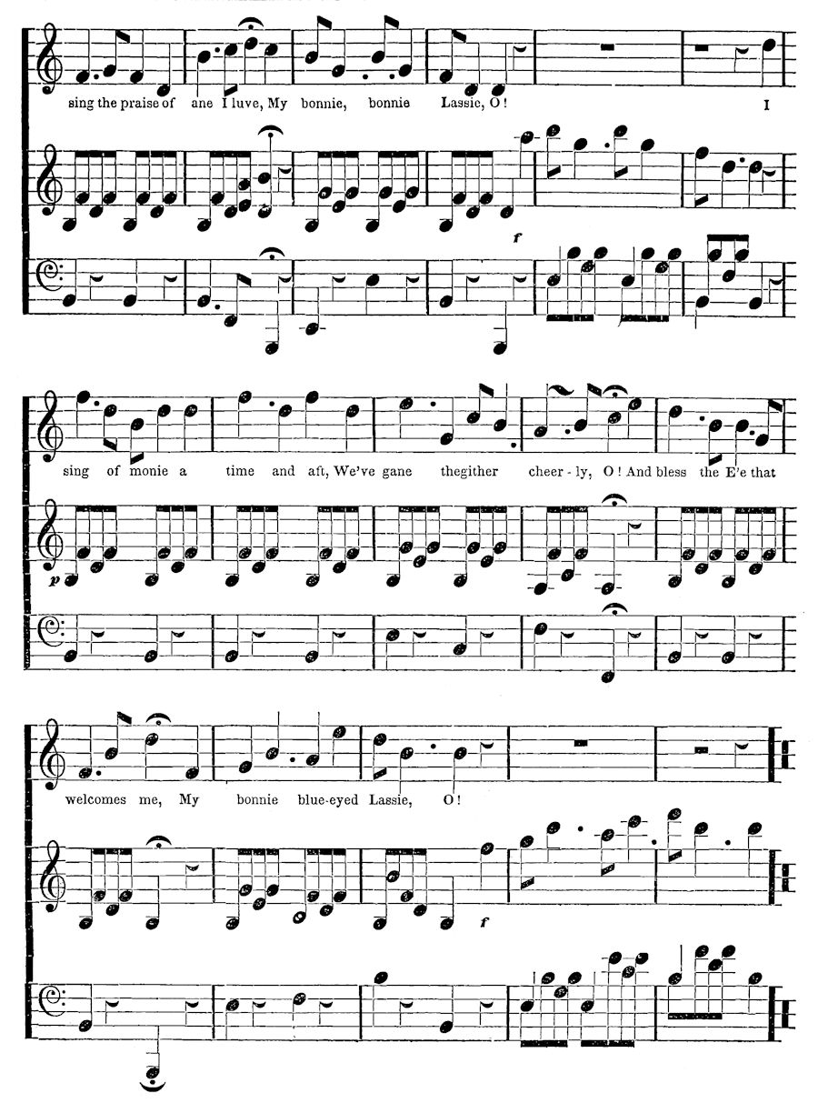 Who does not remember this glorious old song, with its simple melody, and well-managed accompaniments that seem to chime in with every word uttered by the singer, not only upholding him in his sentiment, and illustrating his positions by all kinds of impressive flourishes, but absolutely chuckling and caracoling over the unanswerable nature of the argument? If ever accompaniment expressed a positive certainty that the words of a song were the truest words in the world, it is this very accompaniment. It takes it for granted that nobody will dispute its opinion. It is as dogmatic as Aristotle, or Bob Hobbes, but yet, unlike them in some respects, it seems always to know pretty well what it is talking about. The truth is, that there are few persons who can remain altogether unconvinced by its illustrations, or at least who can remain unpersuaded by its ingenious manner of setting them forth. We say its illustrations, for any one with half an eye can perceive that the “music is married to the immortal verse,” and that the twain are one. We speak of them conjointly when we maintain the force of the song’s illustrations. What indeed can be more forcibly “put,” as the lawyers say, (and sometimes the rhetoricians,) than the points of its thesis? What can be more slyly seducing—what can be more apt to take a body unawares than allusions to “canty hearths where cronies meet, an’ the darlins o’ our e’e?” To be sure, the case might have been better made out if the “morning bleeze” had been kept out of sight, or slurred over as a thing of no moment. Neither was it judicious to dwell upon the “flowery lea,” or the “bonny bee,” or the little “birds in the tree,” and that sort of thing. The song might have taken a hint, too, from our engraving, and said a word about a girl with blue eyes (we presume they are blue,) and auburn hair, (we know it is auburn,) and another little girl and a little boy, both with clean faces, and a dog looking wise at one side of the ingle, with a tabby cat at the other, watching chesnuts in the act of being roasted, and congratulating herself that no fabulous monkey is present to make use of her fair hand as a cat’s paw. All this the song might have forcibly introduced—but we presume it did its best, and we are obliged to it.