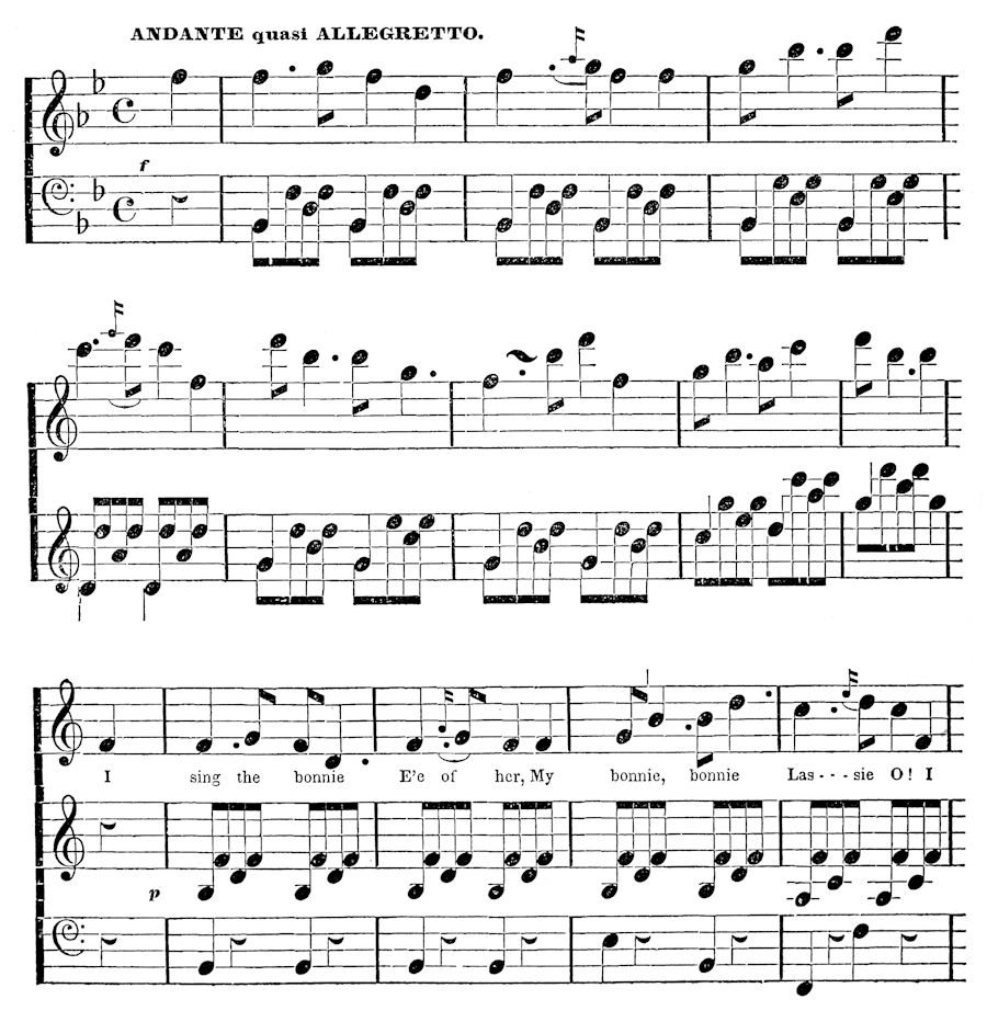 Who does not remember this glorious old song, with its simple melody, and well-managed accompaniments that seem to chime in with every word uttered by the singer, not only upholding him in his sentiment, and illustrating his positions by all kinds of impressive flourishes, but absolutely chuckling and caracoling over the unanswerable nature of the argument? If ever accompaniment expressed a positive certainty that the words of a song were the truest words in the world, it is this very accompaniment. It takes it for granted that nobody will dispute its opinion. It is as dogmatic as Aristotle, or Bob Hobbes, but yet, unlike them in some respects, it seems always to know pretty well what it is talking about. The truth is, that there are few persons who can remain altogether unconvinced by its illustrations, or at least who can remain unpersuaded by its ingenious manner of setting them forth. We say its illustrations, for any one with half an eye can perceive that the “music is married to the immortal verse,” and that the twain are one. We speak of them conjointly when we maintain the force of the song’s illustrations. What indeed can be more forcibly “put,” as the lawyers say, (and sometimes the rhetoricians,) than the points of its thesis? What can be more slyly seducing—what can be more apt to take a body unawares than allusions to “canty hearths where cronies meet, an’ the darlins o’ our e’e?” To be sure, the case might have been better made out if the “morning bleeze” had been kept out of sight, or slurred over as a thing of no moment. Neither was it judicious to dwell upon the “flowery lea,” or the “bonny bee,” or the little “birds in the tree,” and that sort of thing. The song might have taken a hint, too, from our engraving, and said a word about a girl with blue eyes (we presume they are blue,) and auburn hair, (we know it is auburn,) and another little girl and a little boy, both with clean faces, and a dog looking wise at one side of the ingle, with a tabby cat at the other, watching chesnuts in the act of being roasted, and congratulating herself that no fabulous monkey is present to make use of her fair hand as a cat’s paw. All this the song might have forcibly introduced—but we presume it did its best, and we are obliged to it.