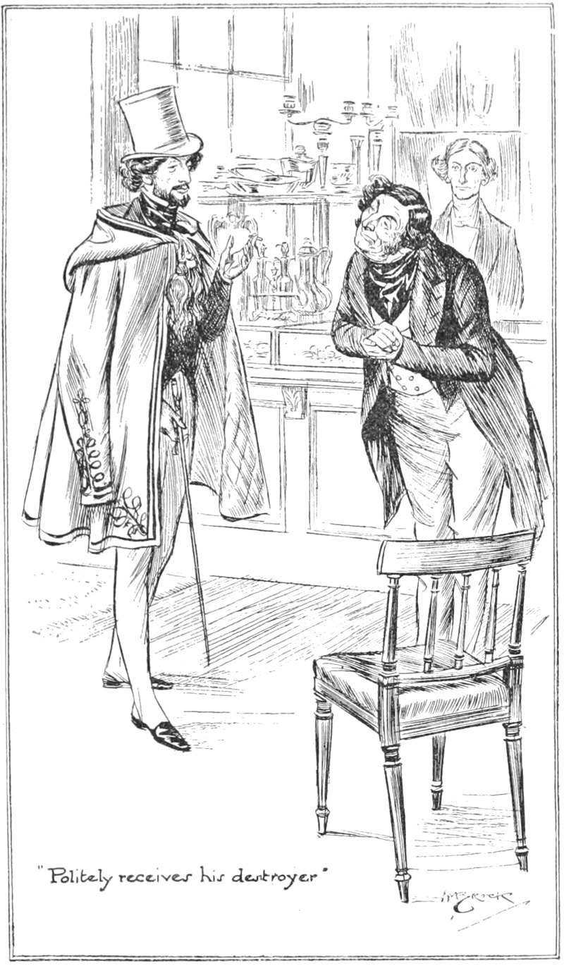 Mark the swindler! How graciously he descends from his chariot—for the swindler of first-rate genius rarely marauds on foot—and with what a composed elegance, with what a perfect self-possession he enters the shop! There is something inexpressibly taking in his manner. Surveying him from head to foot, we cannot repress the opinion that the “age of chivalry” is not past. He is the knight of later times—the Chevalier Bayard in a round hat. Sans peur glows in his eyeball, and the whiteness of his kid gloves is sans reproche! Two or three centuries ago he had, with mailed hand, “shaken the bags of hoarding abbots,” and now comes he, with a condescending smile at his mouth, to deal with a silversmith. See! he crosses the threshold—treads the shop. It is impossible to resist the fascination of his lofty courtesy. The tradesman, wary as he is—suspicious as loss after loss has made him—despite of himself, confesses the supremacy of the stranger, and, with a smiling lip, a twinkling eye, folded palms, and inclined back, politely receives his destroyer. A conversation ensues; and the swindler—I am of course putting the case of a man of genius—fastens upon the tradesman, who every moment becomes more deeply impressed with the 235consequence of his patron; and therefore, having flung to the winds all low suspicion, is the most obsequious, the most humble servant of the swindler. There is nothing too costly for him—nothing too curious; no order too difficult to be met—no time too short for the accomplishment of his wishes. The swindler is evidently a man of the very highest consequence; and the silversmith, if I may adopt a homely expression, is inevitably done, ay, done—