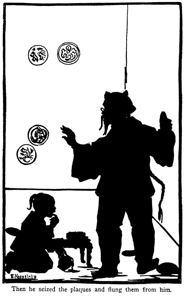 The old man remarked, in a loud tone, that Hai Low spoke nonsense. “Open the door that I may enter, you who deserve a bamboo upon your back. Is this any way to treat your own flesh and blood?” Hai Low repeated his command. “You cannot enter. Go away hurriedly—else I shall pour hot water.” He tilted a kettle and began to pour. Whereupon the old man took to his heels, for the water steamed, hot from a fire. Hai Low was well pleased with himself. Beyond doubt, he would receive great praise from his brother.