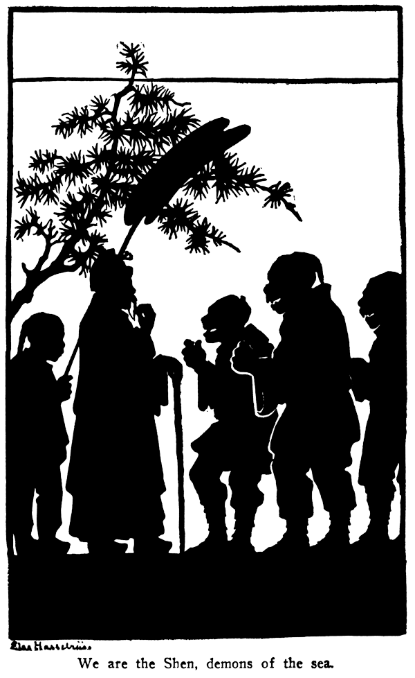 Chueh Chun stretched out a hand to pick up his two hat-shoes, drifted against a willow bough. Said he, rather indistinctly because of the sand in his mouth: “Nothing of the kind, greatly respected neighbors. My fall was most beneficial, for it placed me nearly atop my lost shoes. Otherwise I might never have found them.” He sobbed to prove his joy.