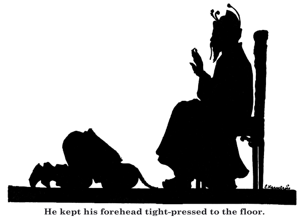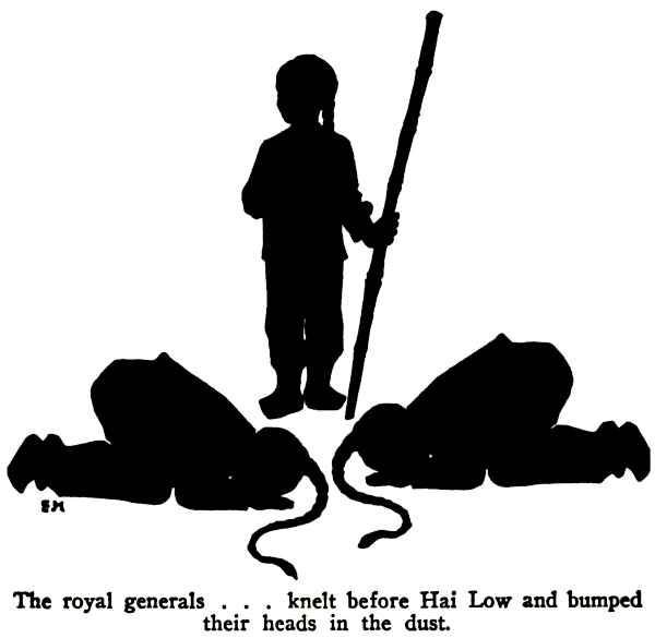 The royal generals, instead of ordering a fight, promptly knelt before Hai Low and bumped their heads in the dust. Said they, “We bow unto our new King.” The palace soldiers said, “Hail to our new King.” And the breathless mob shouted, “Long live our new King.” The crown was placed upon astonished Hai Low’s head. The mace of authority was placed in his hand. And “Hail,” and “Hail,” and “Hail.”