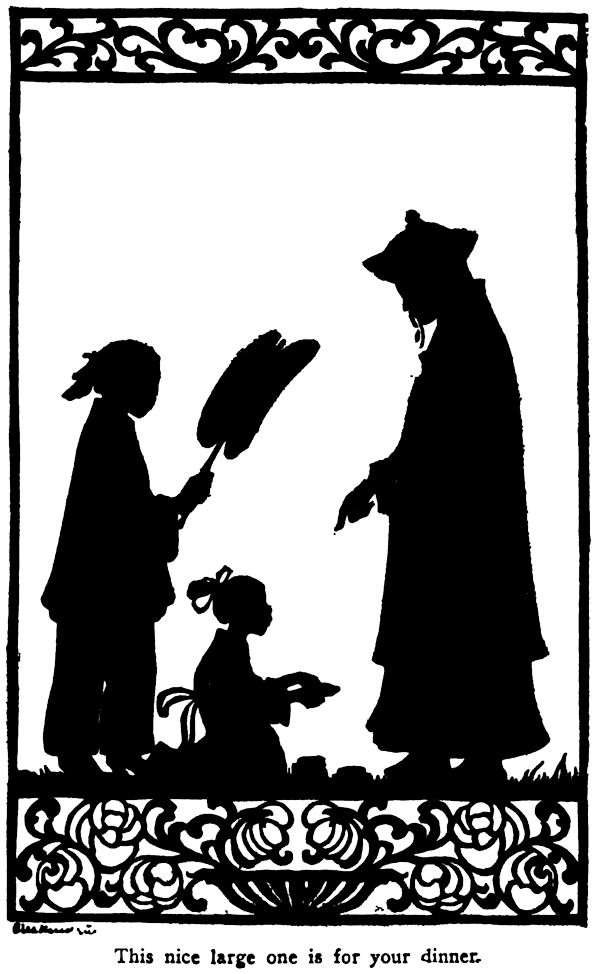 But Hai Lee came home in a huff. Angry, dismayed, was the big brother. “Oh, you wrong-doing Little Brother, you have ruined our future. The man whom you chased away was Grandfather Hai Ho, wealthy and about to make us his heirs. Now he says he will leave us not so much as one cash, not one. For pity’s sake, Small Brother, be more tactful. We have another rich grandfather. When the next stranger comes, ask him if he is your grandfather, before you pour heated water.”