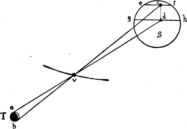 Bei Anwendung dieser Methode auf die Sonne hat man allerdings nun bald erkennen müssen, daß jene »Sonnenparallaxe« so ungemein klein ist, daß sie sich gar nicht genau genug direkt ausmessen ließe. Man mußte zu dieser Fundamentalgröße durch Umwege zu gelangen suchen, deren eingehendere Beschreibung hier zu weit abführen würde. Nur so viel möge angedeutet werden: Man konnte theoretisch genau feststellen, wie weit alle übrigen Planeten, die um die Sonne laufen, von ihr abstehen, wenn man die vorläufig noch unbekannte Entfernung der Erde von ihr gleich eins setzt. Man kann zum Beispiel aus der beobachteten Umlaufszeit der Venus um die Sonne berechnen, daß ihre mittlere Entfernung vom Mittelpunkte des Sonnensystems ganz genau gleich 0,7233322 Teilen der Erdentfernung von der Sonne ist. Wenn man nun die wirkliche Entfernung der Venus von der Sonne oder von uns ausmessen kann, so ist damit offenbar auch die Sonnenentfernung von uns bekannt. Da[9] die Venus aber bei ihrem Umlauf je einmal zwischen Erde und Sonne vorbeigehen muß, so ist dann ihre Entfernung nur 1 – 0,7233… oder 0,2767 Teile von der Sonnenentfernung: Die Parallaxe der Venus ist dann, weil sie so viel näher steht, beinahe viermal größer als die der Sonne und kann also auch um mindestens ebensoviel leichter und genauer gemessen werden. Nun ist freilich unter gewöhnlichen Umständen die Venus überhaupt nicht zu sehen, wenn sie zwischen uns und der Sonne vorbeigeht. Da sie ihr Licht ja allein von der Sonne erhält, so wendet sie uns in jener Stellung ihre Nachtseite zu, die infolge der allgemeinen Helligkeit der Atmosphäre in der Sonnennähe völlig verschwindet. Nur in seltenen Fällen, im Jahrhundert durchschnittlich zweimal, kommt sie so genau zwischen Erde und Sonne vorüber, daß wir sie als scharf begrenzte kleine schwarze Scheibe über die strahlende Sonnenscheibe hinziehen sehen. Es findet dann ein »Venusdurchgang« statt. Die Sehne nun, welche die Venus dabei über die Sonnenscheibe hin beschreibt, wird offenbar verschieden lang sein, je nach der Richtung, aus der wir den Vorgang beobachten. Für einen Beobachter auf der südlichen Halbkugel b in unserer Zeichnung muß die Venus bei c nördlicher über die Sonnenscheibe hinziehen, als für einen bei uns etwa in a aufgestellten Beobachter. Diese Verschiebung für verschiedene irdische Standpunkte gibt aber offenbar die gesuchte Parallaxe. Um sie zu bestimmen, braucht man, wie schon Halley im 17. Jahrhundert erkannt hatte, nur die Ein- und Austritte der Venus am Sonnenrande und dadurch die Zeitdauer zu bestimmen, während deren der Planet vor der Sonne verweilte, woraus sich dann die Länge der Sehne berechnen läßt. Die verschiedene Länge der an den einzelnen Beobachtungsstationen auf diese Weise beobachteten Sehnen ef und gh gibt dann ihre verschiedene Lage auf der Sonnenscheibe an und dadurch auch die parallaktische Verschiebung. Diese Methode der Venusdurchgänge erschien deshalb ganz besonders vorteilhaft, solange man sich noch nicht genügend auf die Sicherheit und Genauigkeit der eigentlichen Winkelmeßinstrumente[10] verlassen konnte, die heute einen ganz erstaunlichen Grad von Präzision gewonnen haben. Es ist daher begreiflich, welch bedeutenden Wert man noch im vergangenen Jahrhundert den Venusdurchgängen von 1874 und 1882 beimaß, zu deren Beobachtung alle zivilisierten Nationen kostspielige Expeditionen in ferne Länder sandten, um so mehr, als unser Jahrhundert überhaupt keine Gelegenheit bietet, das interessante Phänomen zu beobachten. Der nächste Venusdurchgang findet erst wieder am 8. Juni 2004 gegen 10 Uhr morgens nach mitteleuropäischer Zeit statt.