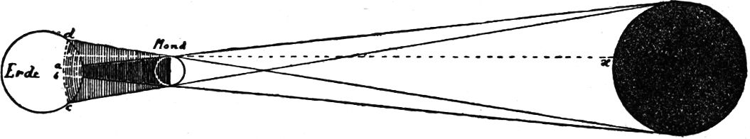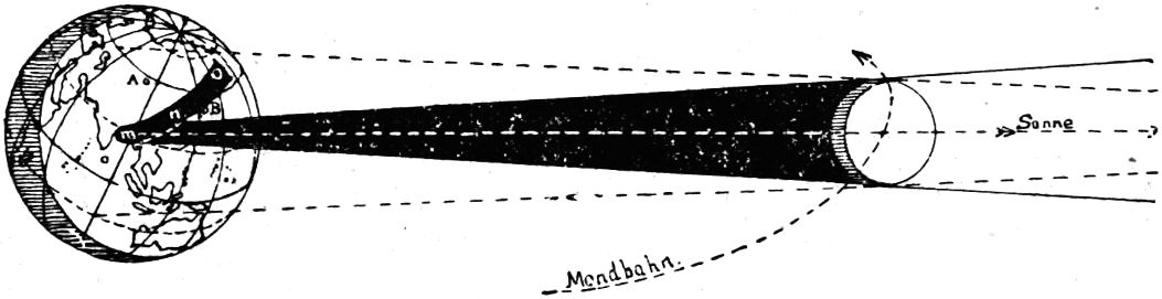 Die scheinbaren Durchmesser von Sonne und Mond sind nun aber veränderlich wegen der wechselnden Entfernungen der beiden Gestirne von uns. Der Mond kann deshalb die Sonne auch völlig verdecken; dann tritt eine totale Finsternis ein. Auf der Zeichnung findet dies auf dem Gebiet von a bis b statt. Während die Dauer der partiellen Verfinsterung sich über zwei Stunden hinziehen kann, währt die eigentliche totale Verfinsterung nur höchstens acht Minuten, in den meisten Fällen aber viel weniger.