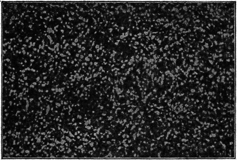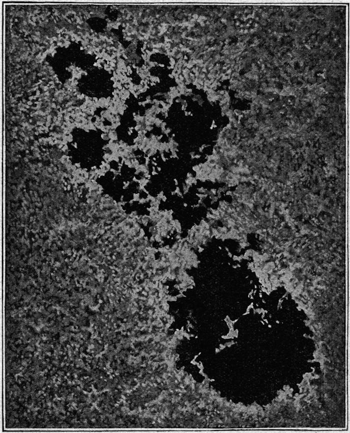 Betrachten wir die Sonne durch ein Fernrohr, oder lassen wir sie ihr eigenes Bild auf der photographischen Platte entwerfen! Da sehen wir dann, daß sie, das Symbol der Reinheit, doch selten ganz fleckenlos ist (s. Abb. oben). Zunächst sehen wir sie überzogen von einer Unzahl von feinen Poren und Linien, einem Netzwerk, das in beständiger Veränderung begriffen ist und offenbar gebildet wird durch Wölkchen, die, unsern Schäfchenwolken (Cirrus) ähnlich, sich eng aneinanderdrängen. Das Ganze nennt man die Granulation der Sonnenoberfläche (s. Abb. S. 22). Man muß sich aber wohl vorstellen, daß diese »Wölkchen« durchschnittlich die Ausdehnung eines irdischen Kontinentes besitzen. Diese wolkenartigen Gebilde grenzen[22] eine bestimmte Atmosphärenschicht der Sonne ab, die sogen. Photosphäre, die eigentliche Lichtspenderin. Über dieser aber befindet sich noch eine andere Luftschicht, die nur bei totalen Finsternissen unmittelbar und deutlich gesehen werden kann und dann einen rosafarbenen Ring um die leuchtende Scheibe bildet, die Chromosphäre. Sie besteht, wie wir gleich noch näher sehen werden, aus den leichtesten bekannten Gasen, Wasserstoff und Helium. Über dieser Schicht endlich breitet sich die oben erwähnte Korona.