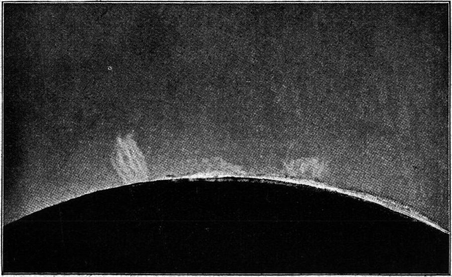 Die Chromosphäre wird von den Protuberanzen durchdrungen. Wir haben schon erfahren, daß es deren zweierlei Arten gibt, die metallischen und die Wasserstoff-Protuberanzen. Wir verstehen nun ohne weiteres diesen Unterschied. Die metallischen Auswürfe kommen aus der Photosphäre. Deshalb stehen sie auch in engeren Beziehungen zu den Flecken. Die Wasserstoff-Protuberanzen dagegen werden meist ihren Ursprung in der Chromosphäre selbst haben und stehen mit den Flecken in keinem Zusammenhang. Früher konnte man, wie ich schon erwähnte, diese Flammen nur während einer totalen Finsternis sehen, da für gewöhnlich die Helligkeit des Sonnenrandes sie weit überstrahlt. Durch das Spektroskop aber sind sie uns jetzt dauernd sichtbar gemacht.