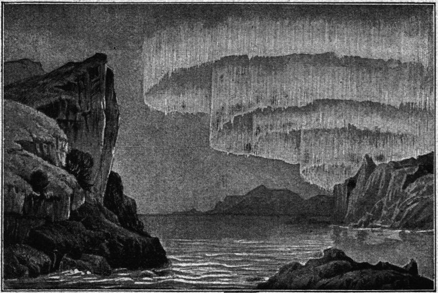 »Jetzt breitet das Nordlicht über das Himmelsgewölbe seinen glitzernden Silberschleier aus, der sich nun in Gelb, nun in Grün, nun in Rot verwandelt; er breitet sich aus und zieht sich wieder zusammen in ruheloser Veränderung, um sich dann in wehende vielfarbige[38] Bänder von blitzendem Silber zu teilen, über die wellenförmige glitzernde Strahlen dahinschießen; dann verschwindet die Pracht. Im nächsten Augenblicke erschimmert sie in Flammenzungen gerade im Zenit, dann wieder schießt ein heller Strahl vom Horizont gerade empor, bis das Ganze im Mondschein fortschmilzt. Es ist, als ob man den Seufzer eines verschwindenden Geistes vernähme. Hier und dort sind noch einige wehende Lichtstrahlen, unbestimmt wie eine Vorahnung – sie sind der Staub von dem glänzenden Gewande des Nordlichts. Aber jetzt nimmt es wieder zu, es schießen weitere Blitze empor, und das endlose Spiel beginnt aufs neue. Und während der ganzen Zeit diese Totenstille, eindrucksvoll wie eine Symphonie der Unendlichkeit.«