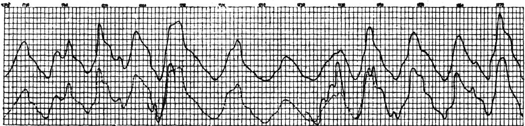Haben wir hier einen direkten Einfluß der Sonnenflecke auf irdische Zustände und Vorgänge feststellen können, so finden nun auch noch gewisse allgemeinere Beziehungen statt. Zunächst wird es nicht wundernehmen, daß auch die langsamen, jährlichen Schwankungen der Magnetnadel mit den Schwankungen der Fleckenhäufigkeit parallel gehen. Ich gebe hier die beiden zugehörigen Kurven wieder, wie sie Rudolf Wolf, der diesen Zusammenhang aufdeckte, seinerzeit für den Zeitraum von 1745–1875 aufgestellt hat. Die obere Linie gilt für die Sonnenflecke, die untere für die Abweichungen der Magnetnadel. Man sieht, die Übereinstimmung ist vollkommen.