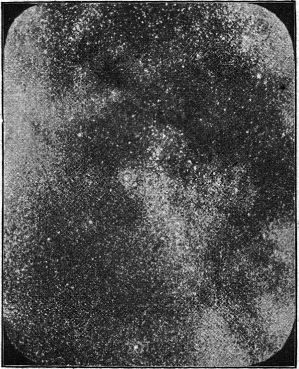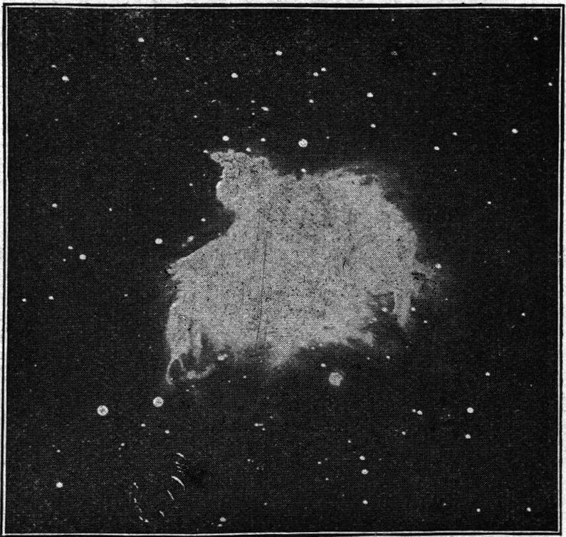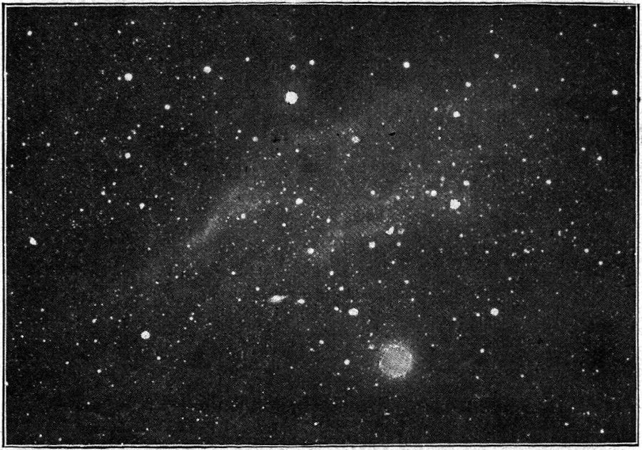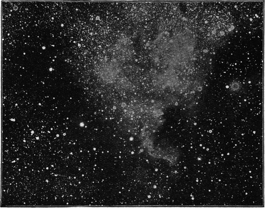 Die nächste Abbildung zeigt den sogen. »Amerikanebel«. Der in seiner Gestalt Zentralamerika entsprechende Teil windet sich, als sei hier der Anfang einer Spirale. Rings um den Nebel herum befindet[86] sich, wie überhaupt bei den meisten ähnlichen Gebilden, eine sternarme Region. Es hat demnach den Anschein, als ob sich in dem Nebel die umgebende Materie zu vereinigen trachte, um hier in den Weltenwerkstätten gebührende Verwendung zu finden.